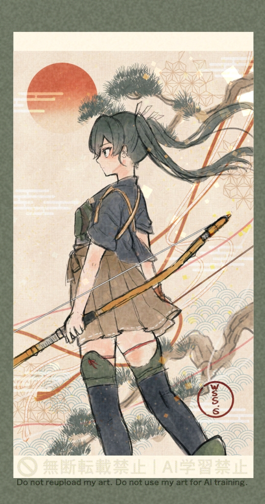 1girl artist_logo black_thighhighs bow_(weapon) brown_skirt expressionless feet_out_of_frame from_behind grey_hair hakama hakama_skirt japanese_clothes kantai_collection logo pleated_skirt skirt solo sun tasuki thighhighs tree twintails weapon wss_(nicoseiga19993411) zuikaku_(kancolle) zuikaku_kai_ni_(kancolle)