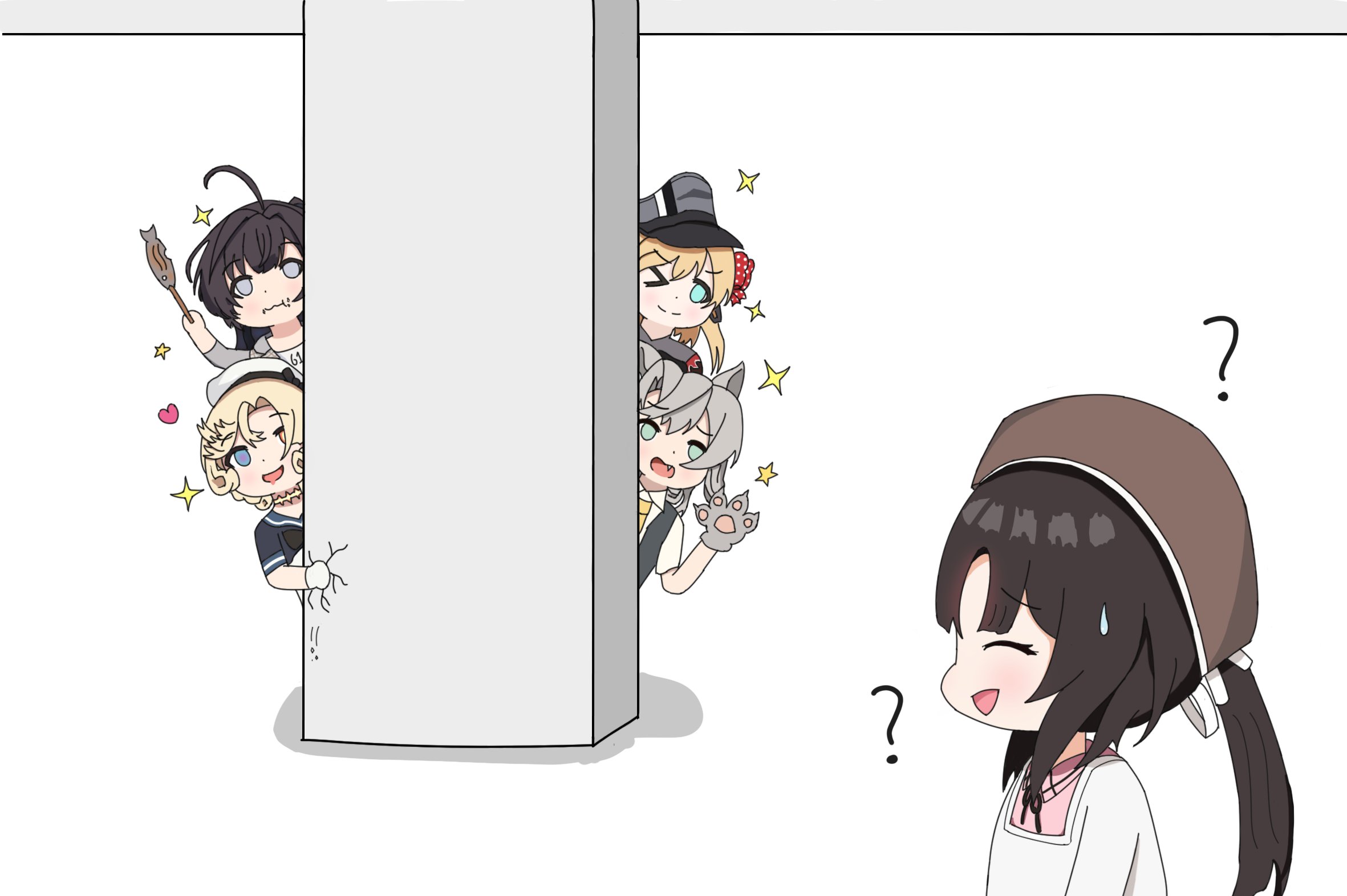 5girls ? akizuki_(kancolle) akizuki_(saury_festival)_(kancolle) apron brown_hat column commentary_request crack fish hat highres janus_(kancolle) kantai_collection kappougi multiple_girls nankai_(kancolle) nosaki_(kancolle) nowaki_(halloween)_(kancolle) nowaki_(kancolle) one-hour_drawing_challenge one_eye_closed peeking_out pillar ponytail prinz_eugen_(kancolle) waving