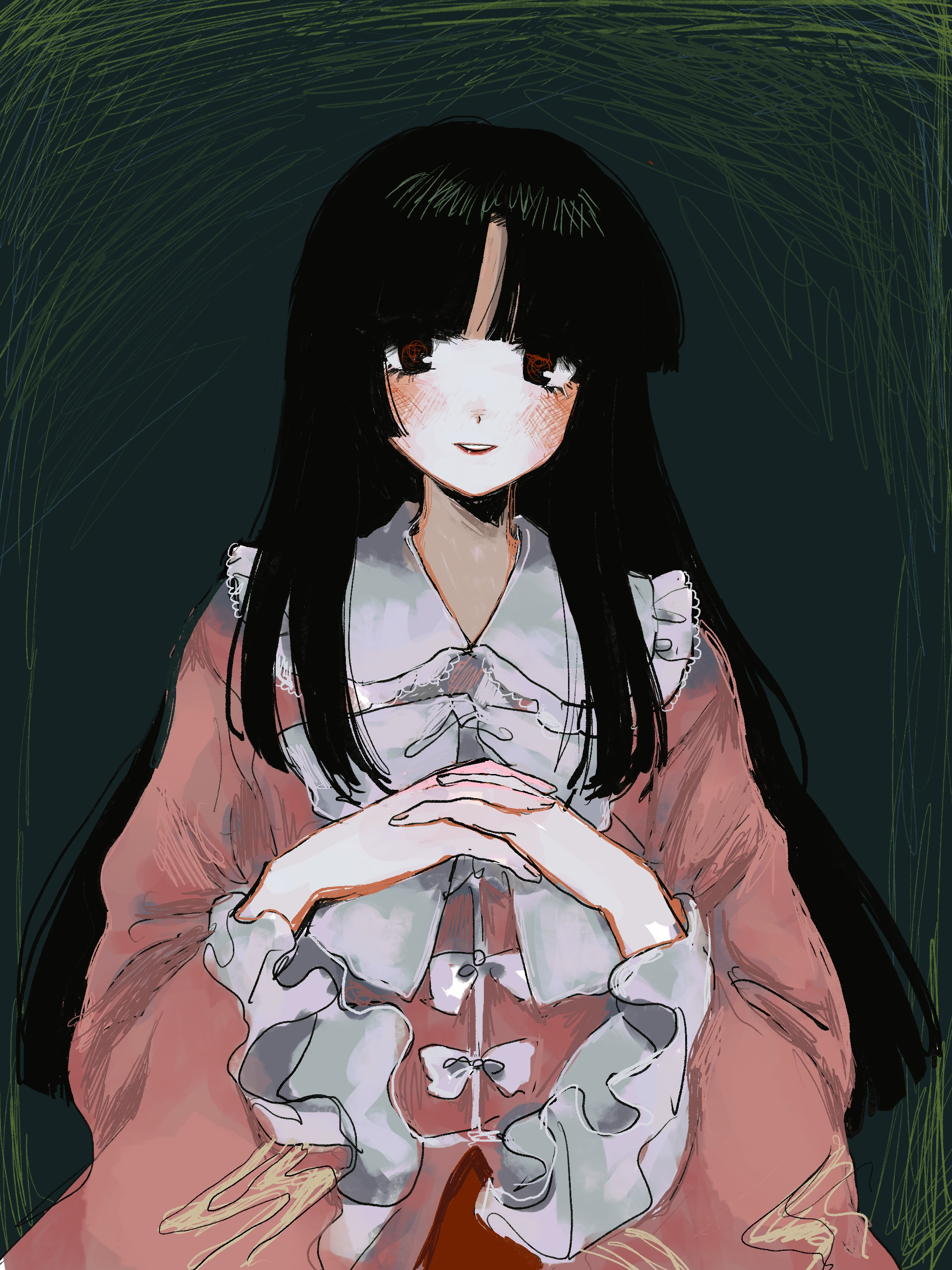 1girl absurdres black_hair blunt_bangs blunt_ends blush bow bowtie commentary frilled_sailor_collar frilled_sleeves frills green_background highres hime_cut houraisan_kaguya light_smile long_hair long_sleeves looking_at_viewer own_hands_together pink_shirt sailor_collar shirt solo straight_hair subaru_(user_tmwv7722) touhou upper_body very_long_hair white_bow white_bowtie white_sailor_collar