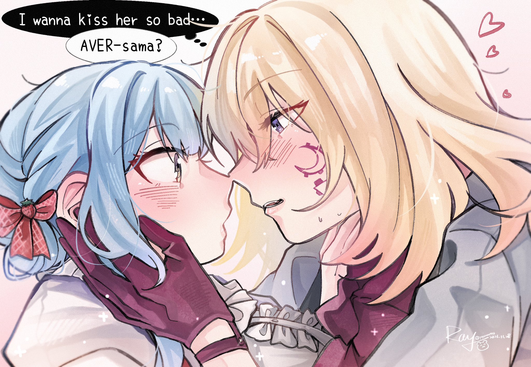 2girls aver_(yumenokessho) bang_dream! bang_dream!_it's_mygo!!!!! blonde_hair blue_hair blush bow center_frills chinese_commentary commentary_request doloris_(bang_dream!) english_text facial_mark food frills fruit gloves hair_between_eyes hair_bow highres imminent_kiss medium_hair misumi_uika multiple_girls open_mouth purple_eyes red_bow red_gloves short_hair_with_long_locks sidelocks strawberry sweets_paradise togawa_sakiko yellow_eyes yoyoray20001996 yumenokessho yuri