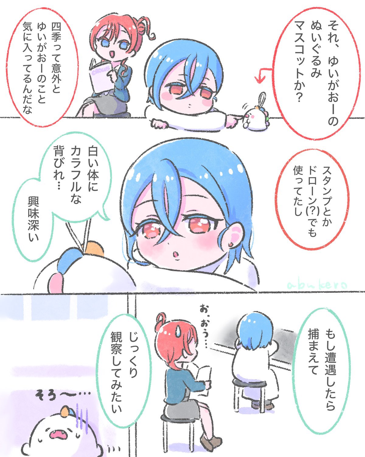 2girls :d abukero arrow_(symbol) artist_name blue_eyes blue_hair book colored_speech_bubble comedic_sweatdrop commentary_request earrings hair_bun highres holding holding_book jewelry lab_coat long_sleeves love_live! love_live!_superstar!! multiple_girls on_stool open_mouth orange_eyes poking red_hair school_uniform short_hair_with_long_locks single_side_bun sitting smile speech_bubble stool stud_earrings wakana_shiki yoneme_mei yuigao yuigaoka_school_uniform