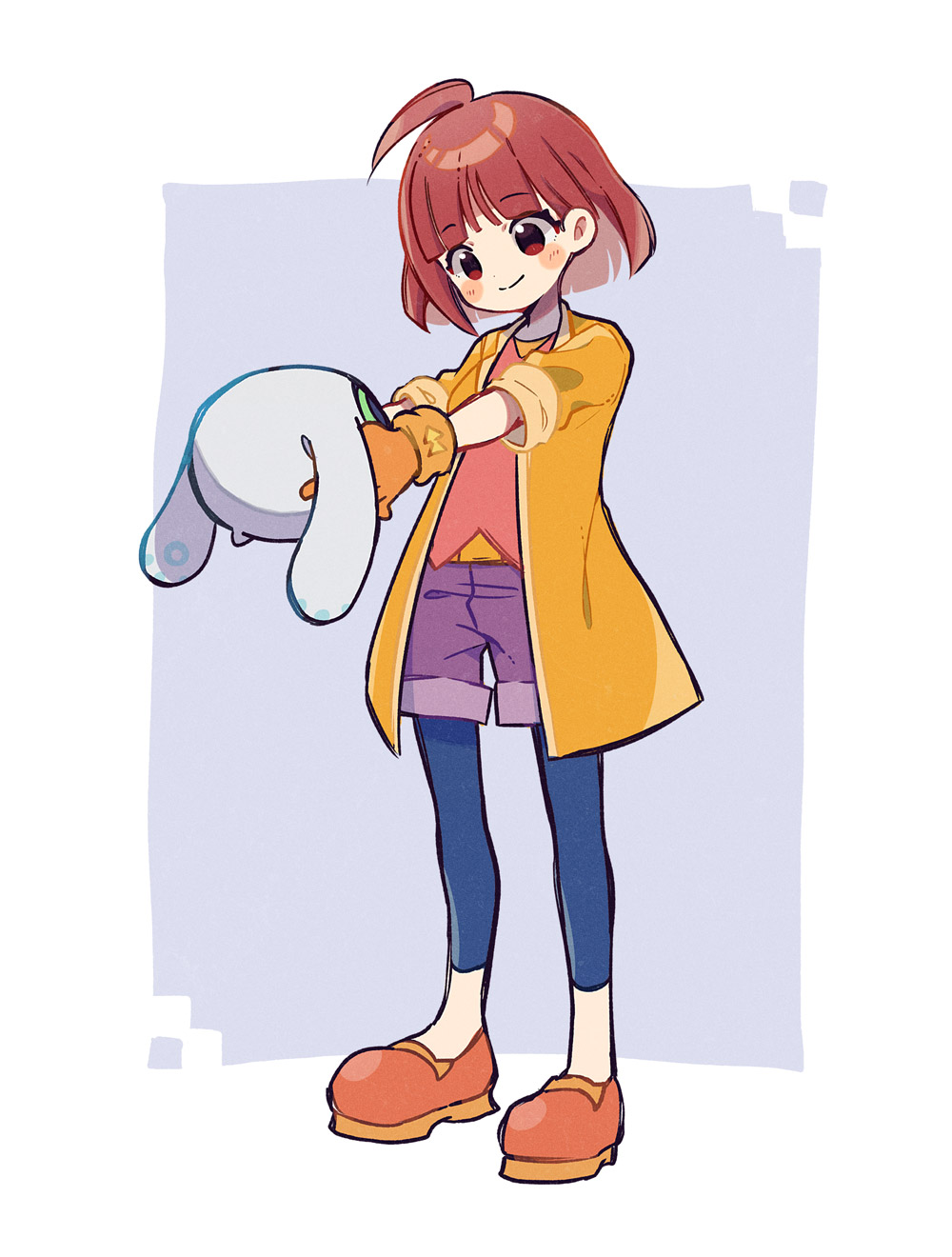 1girl ahoge atari_(puyopuyo) blue_leggings brown_hair brown_shoes closed_mouth coat full_body gloves highres holding kaxxxxx_324 leggings looking_at_another non-humanoid_robot open_clothes open_coat orange_coat orange_gloves purple_shorts puubot_(puyopuyo) puyopuyo puyopuyo_quest red_eyes red_shirt robot shirt shoes short_hair shorts sleeves_rolled_up smile standing