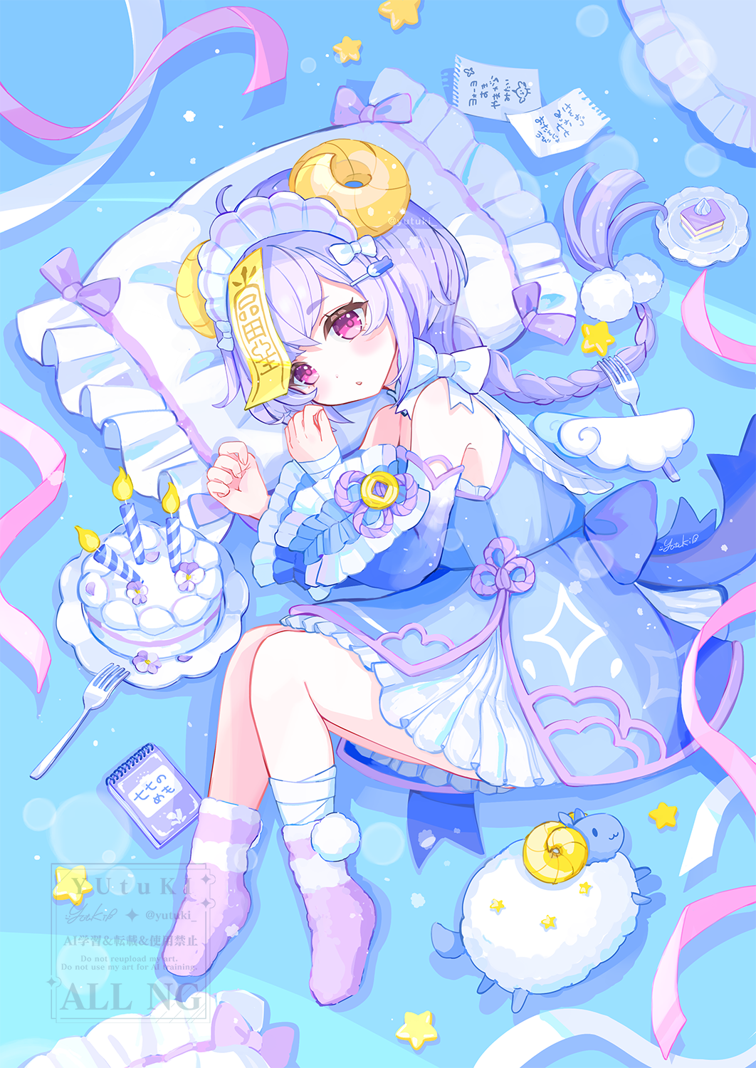 1girl bandaged_leg bandages bare_shoulders blue_background blue_dress blue_sleeves blush braid commentary_request detached_sleeves dress fork frilled_sleeves frills full_body genshin_impact highres horns long_hair long_sleeves looking_at_viewer lying maid_headdress ofuda ofuda_on_head on_side parted_lips pillow pink_ribbon pink_socks pleated_dress purple_hair qiqi_(genshin_impact) red_eyes ribbon sheep sheep_horns sleeveless sleeveless_dress socks solo star_(symbol) watermark wide_sleeves yutukicom