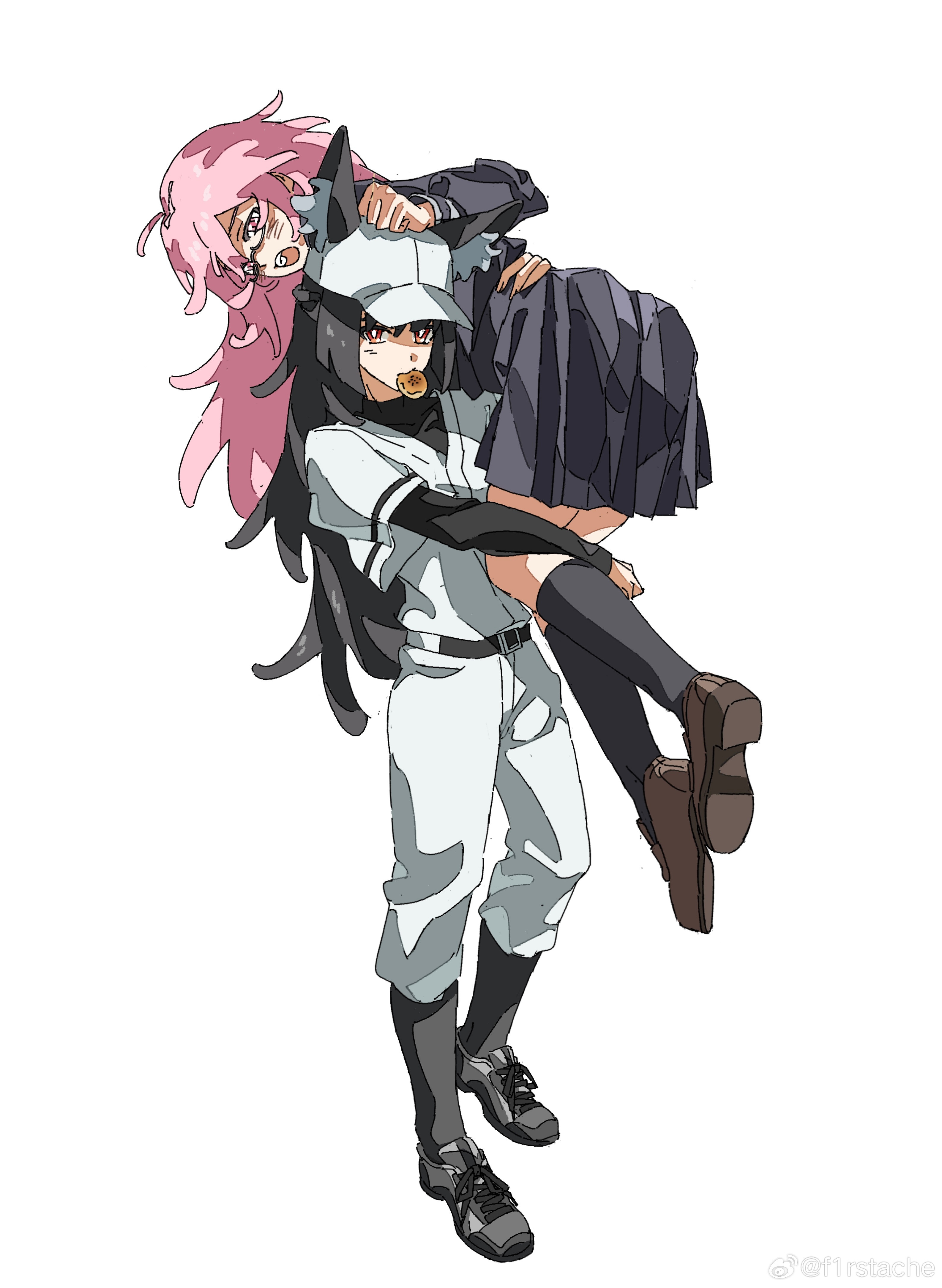 2girls absurdres alternate_costume animal_ear_fluff animal_ears bad_link bad_weibo_link baseball_cap black_hair blunt_bangs blush carrying carrying_person f1rstache fox_ears fox_girl full_body glasses hat highres hoshimi_miyabi long_hair looking_at_viewer multiple_girls open_mouth pink_eyes pink_hair red_eyes red_hair school_uniform sidelocks simple_background standing tsukishiro_yanagi white_background yuri zenless_zone_zero