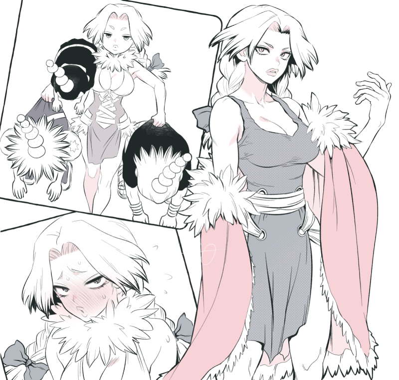 1girl bare_shoulders blush bow braid breasts cape carrying cleavage dr._stone dress flying_sweatdrops fur-trimmed_cape fur_trim hair_bow hanada_nikki large_breasts limited_palette lips long_hair looking_at_viewer magma_(dr._stone) monochrome multiple_views ninomae_gin parted_bangs parted_lips partially_colored puckered_lips red_cape spot_color sweat twin_braids uei_you white_background