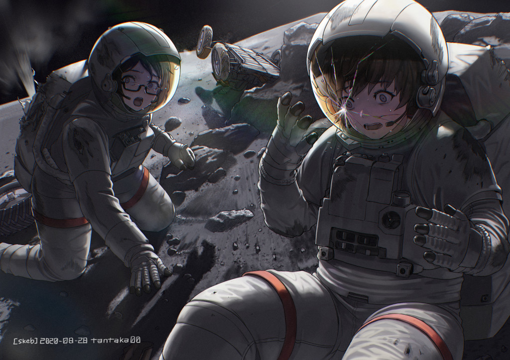 2girls black-framed_eyewear black_hair brown_hair commission crack cracked_glass glasses gloves grey_eyes hands_up headset kneeling multiple_girls on_ground open_mouth original purple_eyes semi-rimless_eyewear sitting skeb_commission spacesuit tantaka under-rim_eyewear wheel white_gloves wide-eyed