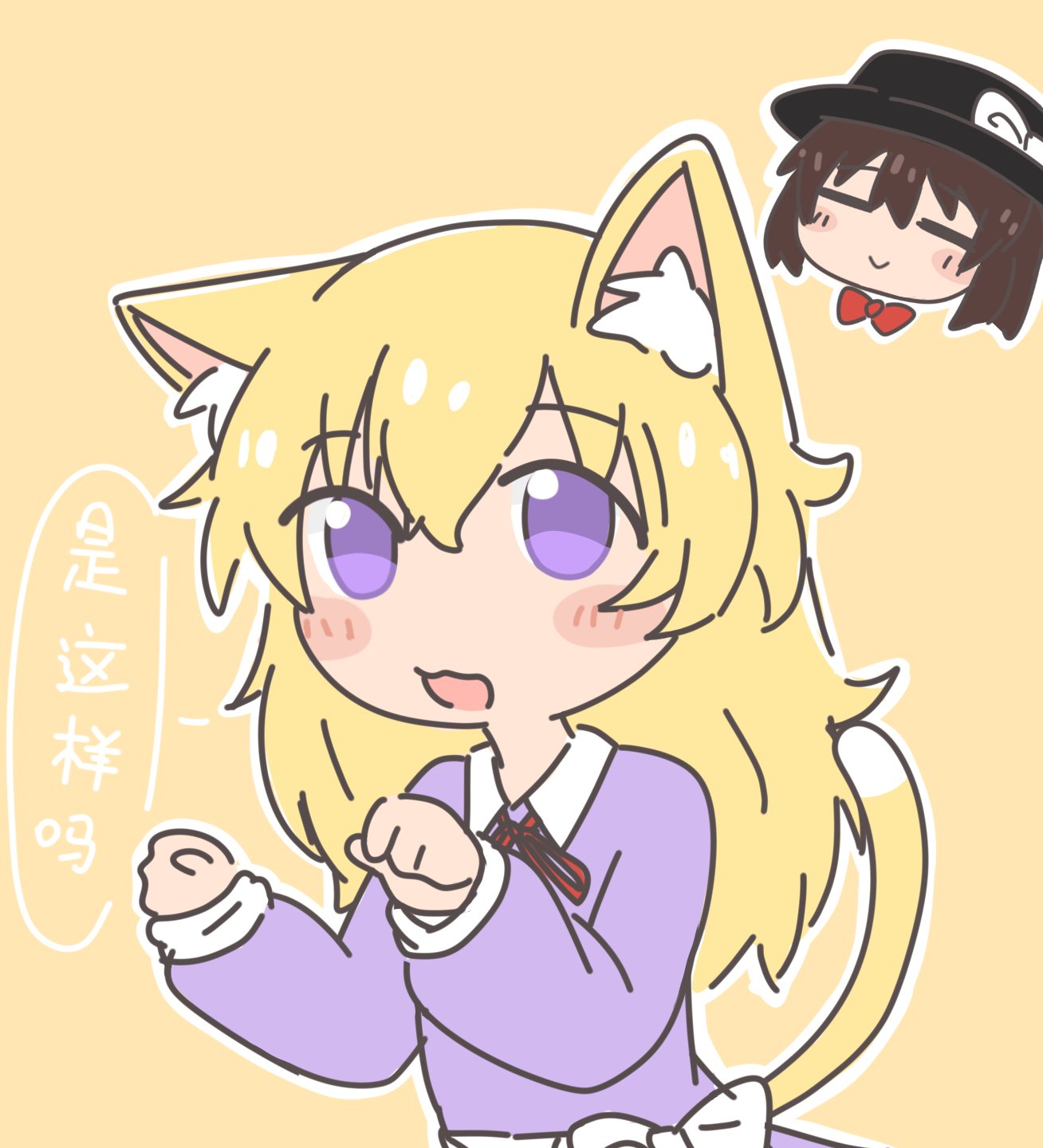 2girls animal_ears black_hat blonde_hair blush bow bowtie brown_hair cat_ears cat_tail closed_eyes collared_dress commentary_request cropped_head dress hat hat_ribbon highres kemonomimi_mode kokoda402989934 long_hair long_sleeves looking_at_another maribel_hearn multiple_girls open_mouth outline purple_dress purple_eyes red_bow red_bowtie ribbon smile solo_focus tail touhou translation_request upper_body usami_renko waist_bow wavy_mouth white_outline yellow_background