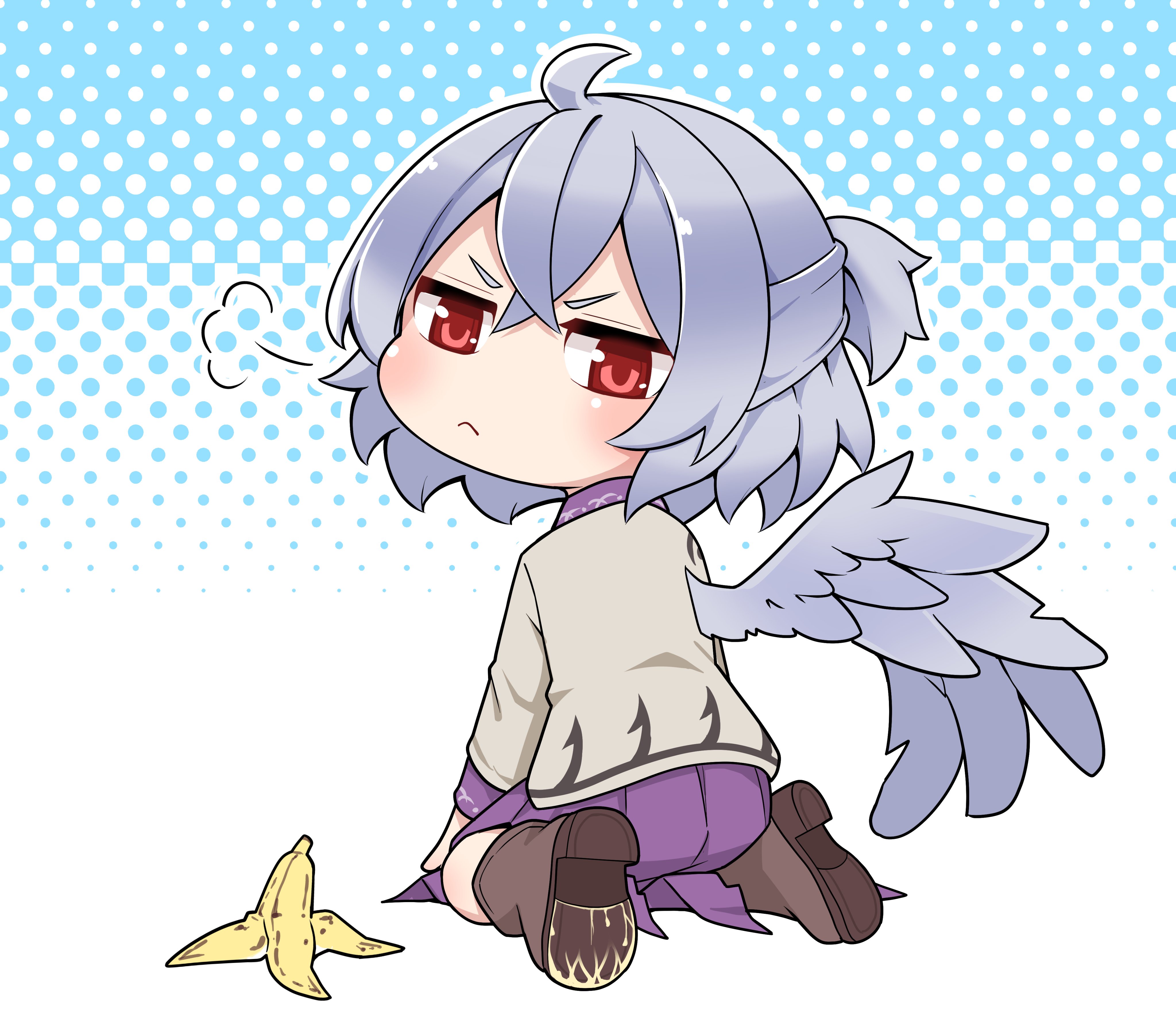 1girl absurdres banana_peel blush brown_shoes chibi commission frown highres jacket kishin_sagume kneeling looking_at_viewer looking_back polka_dot polka_dot_background puff_of_air purple_skirt red_eyes shoes short_hair single_wing skeb_commission skirt slipping_on_banana_peel solo tamahana touhou white_hair white_jacket wings