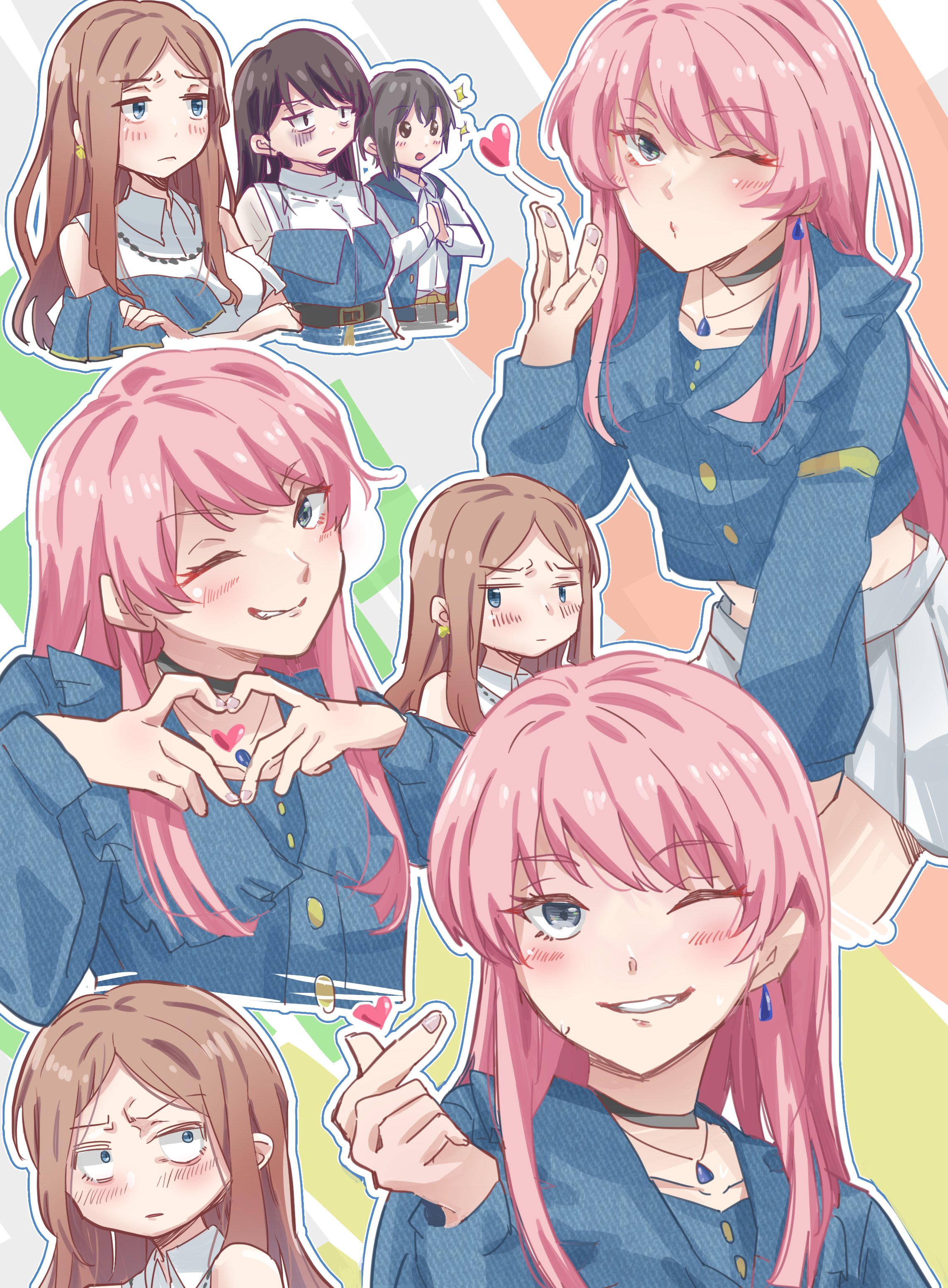 4girls absurdres bang_dream! bang_dream!_it's_mygo!!!!! black_choker black_hair blue_eyes blue_jacket blush brown_eyes brown_hair chihaya_anon choker commentary_request cropped_jacket crossed_arms earrings fang finger_heart floating_clothes grey_eyes grey_hair heart heart_hands heart_in_heart_hands highres jacket jealous jewelry karakuzu_mygo long_hair midriff multiple_girls nagasaki_soyo one_eye_closed open_mouth outline pink_hair shiina_taki short_hair sidelocks takamatsu_tomori white_outline
