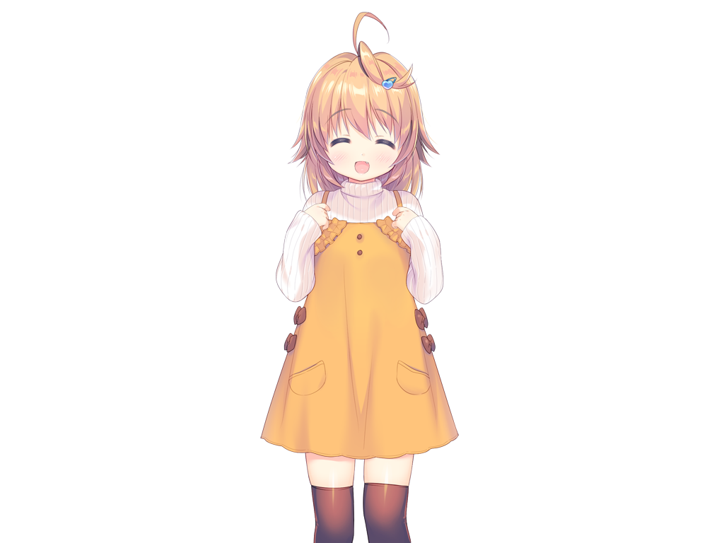 1girl :d ^_^ ahoge blonde_hair brown_thighhighs chishima_mako closed_eyes dress facing_viewer fang feet_out_of_frame game_cg hair_between_eyes hair_ornament hands_up heart heart_hair_ornament large_variant_set long_sleeves medium_hair non-web_source open_mouth pinafore_dress piyodera_mucha pocket ribbed_sweater self-datamine simple_background sleeveless sleeveless_dress smile solo soushisouai_lolita_no_seikatsu standing sweater tachi-e thighhighs transparent_background variant_set white_sweater yellow_dress
