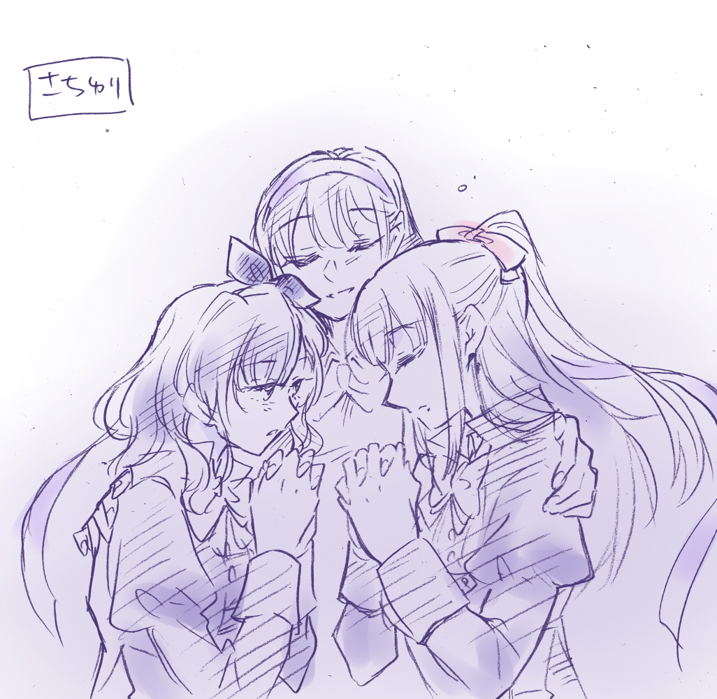3girls arm_around_shoulder assault_lily bow bowtie character_name closed_eyes commentary_request facing_another from_side fukuyama_jeanne_sachie gradient_background grey_background hair_bow hairband half_updo hand_on_another's_shoulder hands_up interlocked_fingers jacket juliet_sleeves kishimoto_maria_mirai kuroki_francisca_yuria long_sleeves looking_at_another ludvico_private_girls'_academy_school_uniform medium_hair monochrome multiple_girls own_hands_clasped own_hands_together parted_lips pink_bow profile puffy_sleeves purple_hairband purple_theme santouka school_uniform smile spot_color translated upper_body white_background