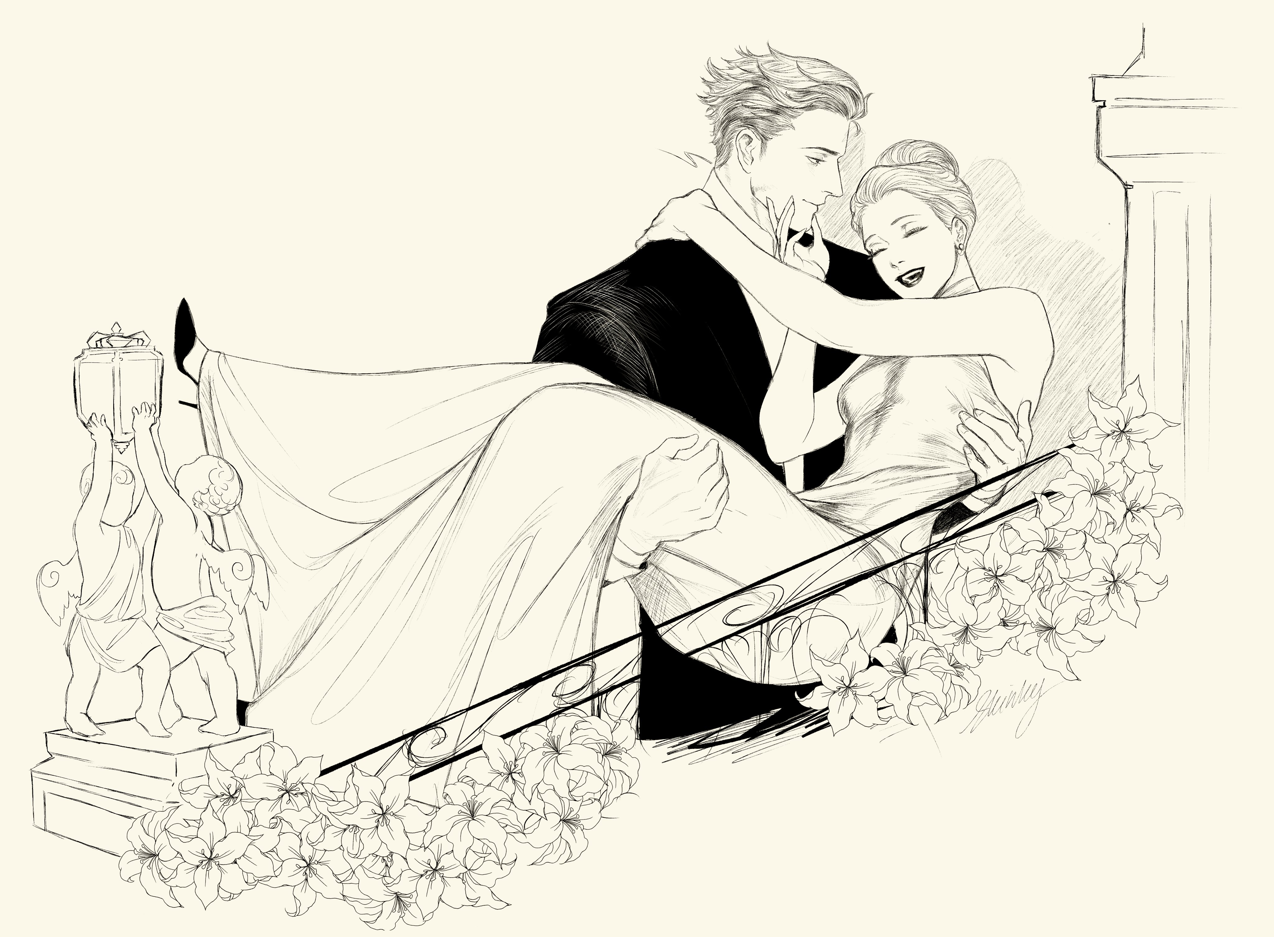 1boy 1girl ^_^ absurdres alexander_(veil) carrying carrying_person closed_eyes commentary dress earrings emma_(veil) flower greyscale hair_bun hair_slicked_back high_heels highres jewelry long_dress monochrome open_mouth skinky sleeveless sleeveless_dress smile turtleneck turtleneck_dress veil_(manga)