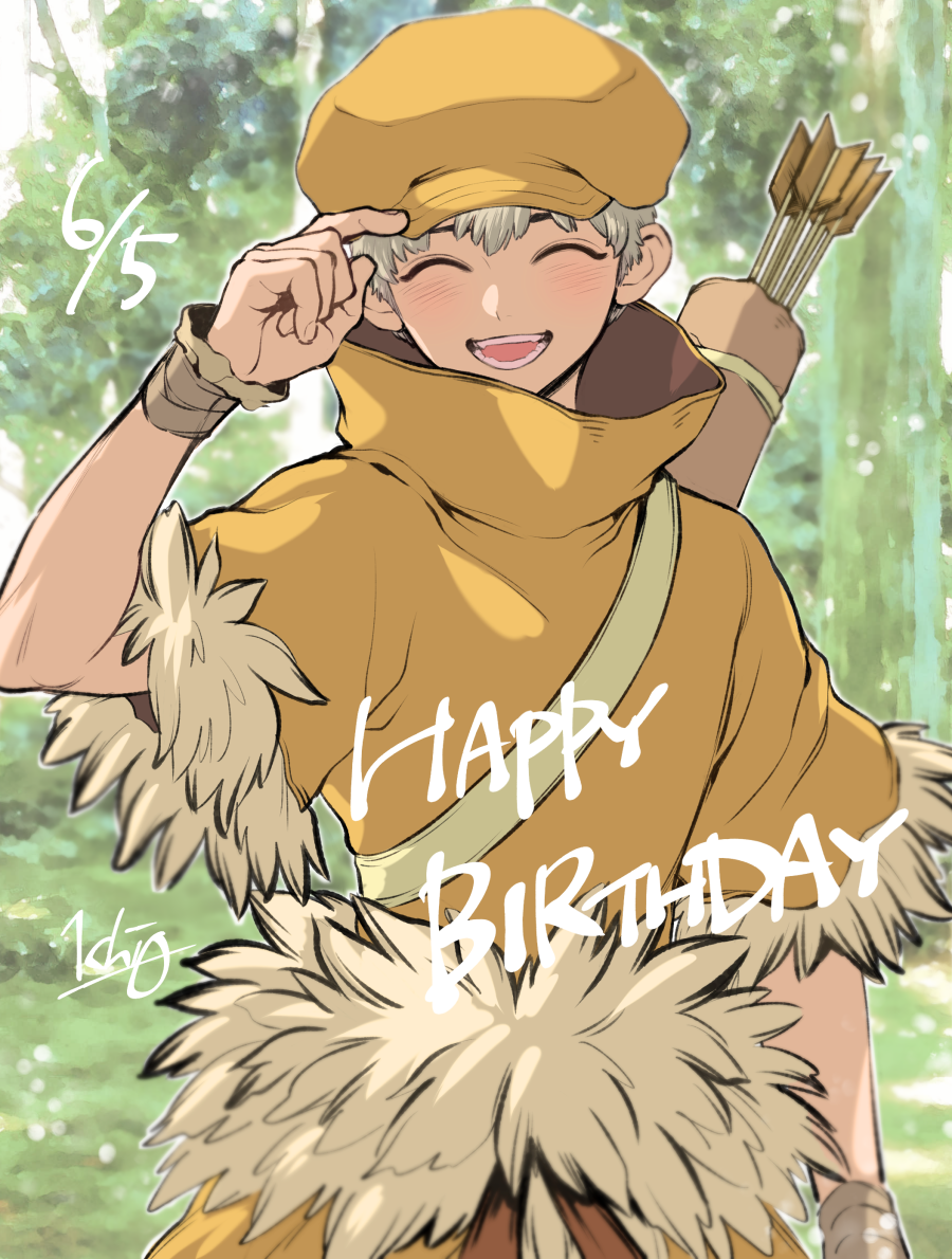 1boy adjusting_clothes adjusting_headwear arrow_(projectile) birthday blush closed_eyes commentary_request dated dr._stone facing_viewer forest fur_trim grey_hair hand_on_headwear happy_birthday hat male_focus nature newsboy_cap ninomae_gin open_mouth outdoors pants quiver saionji_ukyou shirt short_hair short_sleeves smile solo teeth tree wristband yellow_shirt
