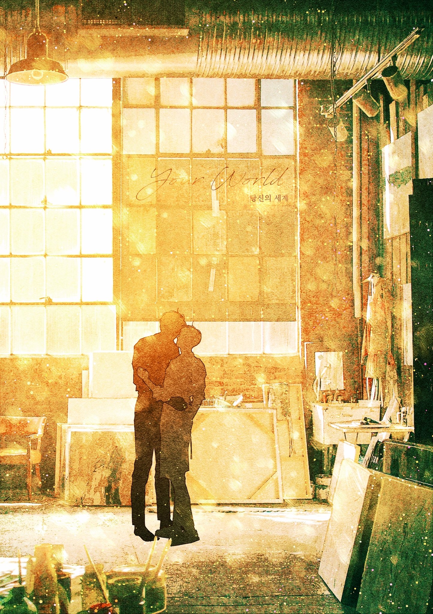 2boys bellta_(kimbellta) bucket ceiling_light commentary_request easel facing_another hand_on_another's_arm hand_on_another's_back highres indoors kim_dokja korean_commentary male_focus multiple_boys omniscient_reader's_viewpoint scenery shop short_hair silhouette watercolor_effect yoo_joonghyuk