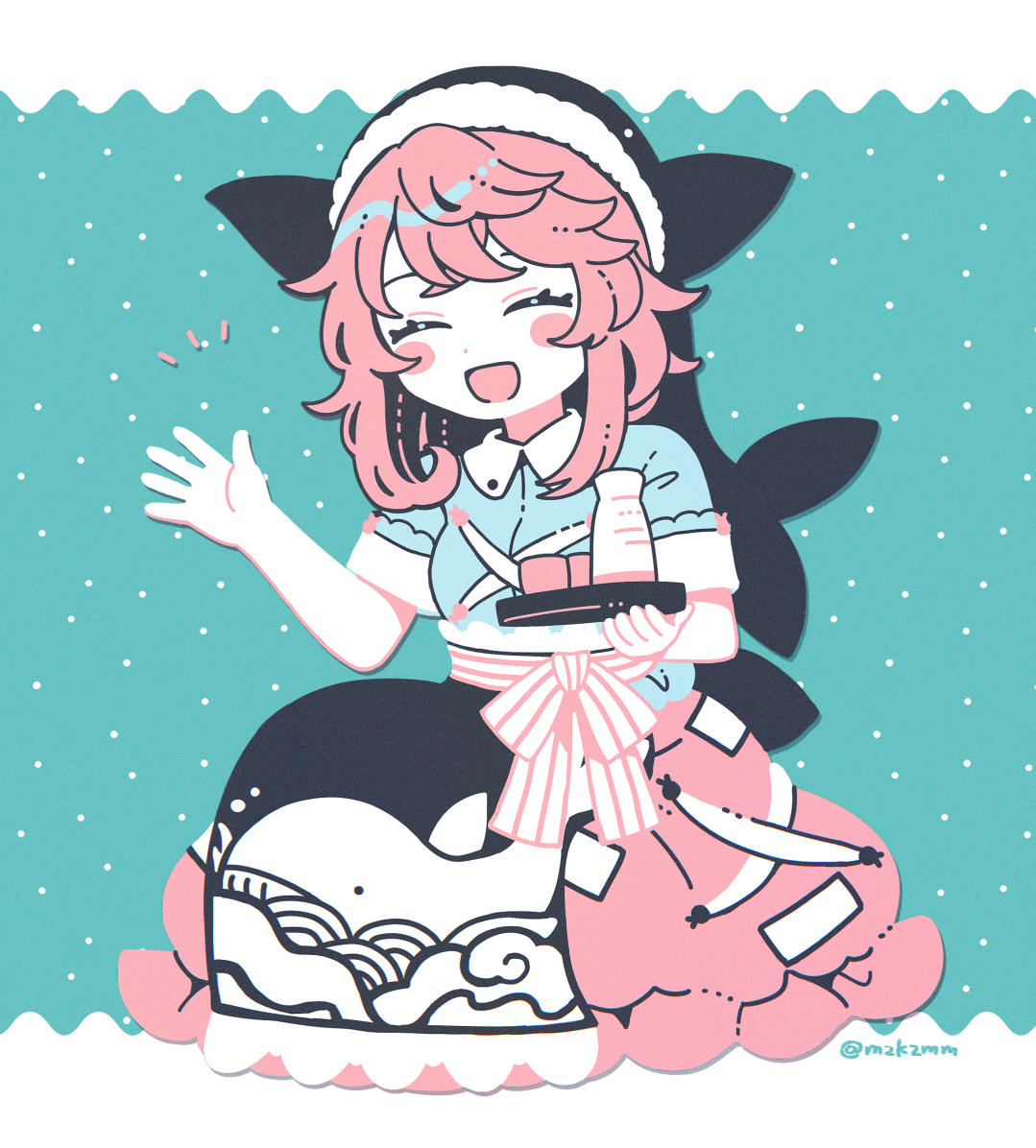 1girl :d animal_print apron blue_apron blue_shirt blush_stickers breasts closed_eyes commentary_request cross-laced_clothes cup fish_print frilled_apron frilled_sleeves frills full_body holding holding_tray limited_palette mozukuzu_(manukedori) okunoda_miyoi open_mouth pink_hair pink_skirt sash shirt short_hair short_sleeves skirt small_breasts smile solo squatting touhou tray waving whale_hat whale_print