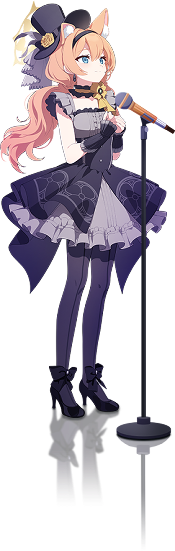 1girl animal_ear_fluff animal_ears black_dress black_hat black_leggings black_shoes blue_archive blue_eyes closed_mouth dress female_focus frills hat high_heels highres leggings light_smile mari_(blue_archive) mari_(idol)_(blue_archive) microphone microphone_stand official_art orange_hair reflection shoes simple_background smile solo standing tagme top_hat transparent_background twintails