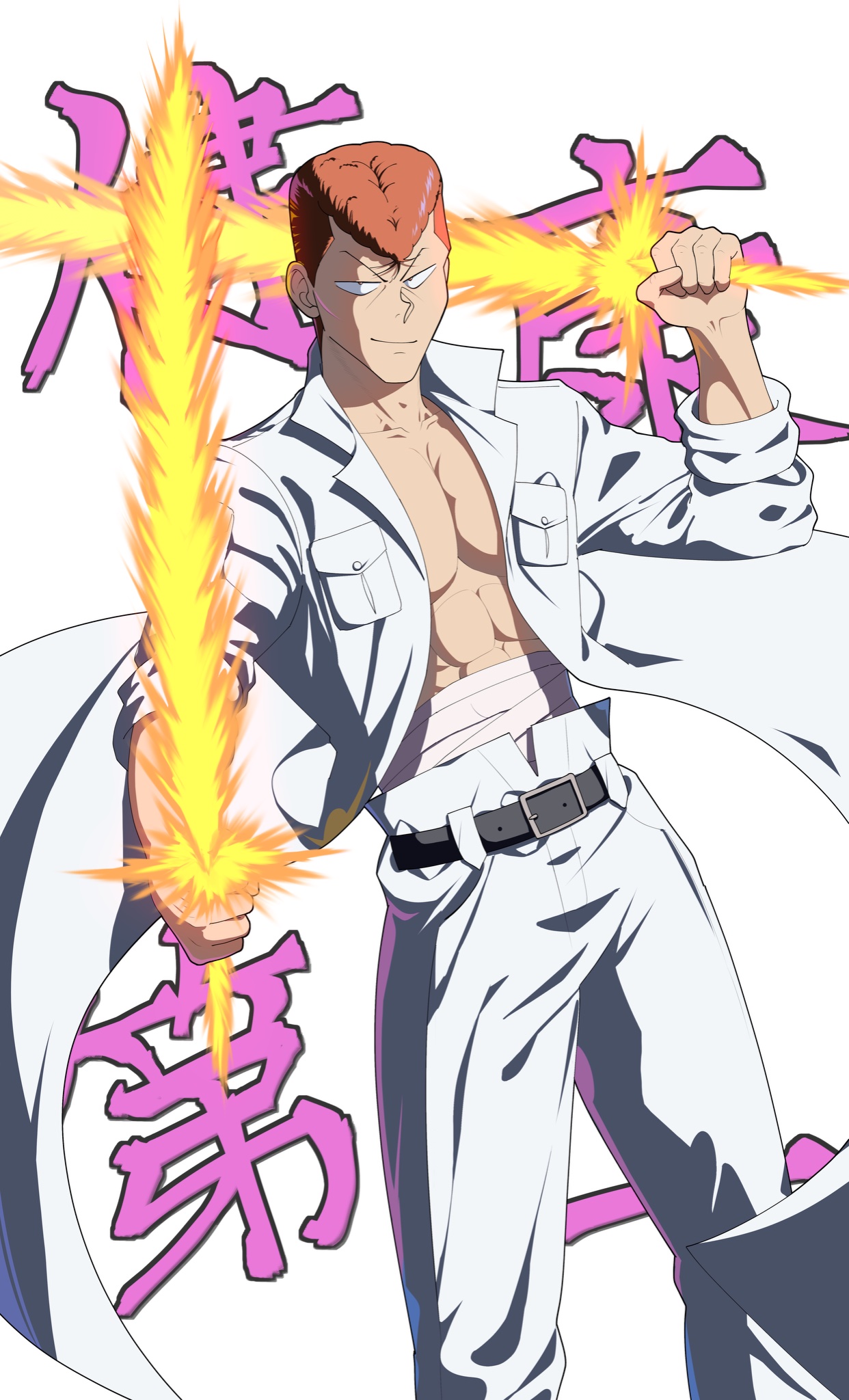 1boy bandaged_chest closed_mouth collared_jacket highres holding holding_sword holding_weapon jacket kuwabara_kazuma male_focus muscular muscular_male open_clothes open_jacket orange_hair pants pompadour qinokonoko0513 sleeve_cuffs solo sword weapon white_background yuu_yuu_hakusho