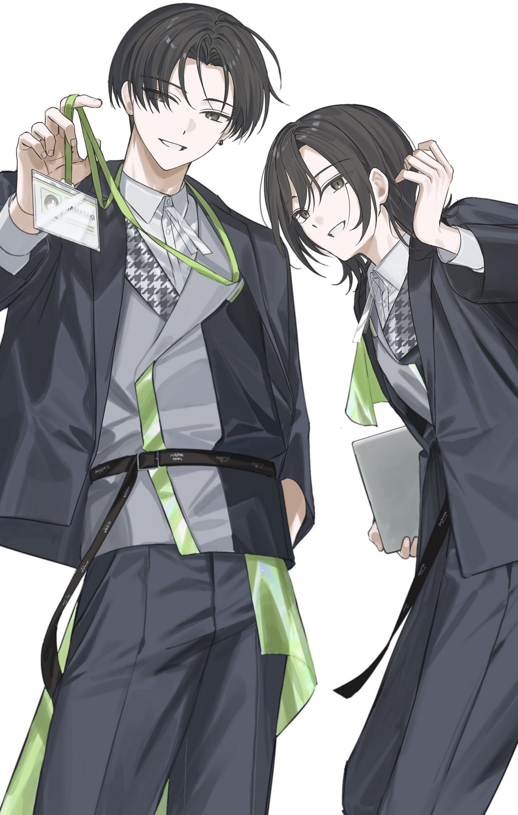 18trip 1boy 1girl 22kolink belt black_belt black_eyes black_hair black_jacket black_pants cowboy_shot earrings from_below hair_between_eyes hamasaki_kaede hamasaki_momiji hand_in_pocket hand_up highres holding_lanyard houndstooth id_card jacket jewelry lanyard long_sleeves looking_at_viewer medium_hair pants short_hair siblings simple_background single_earring smile white_background