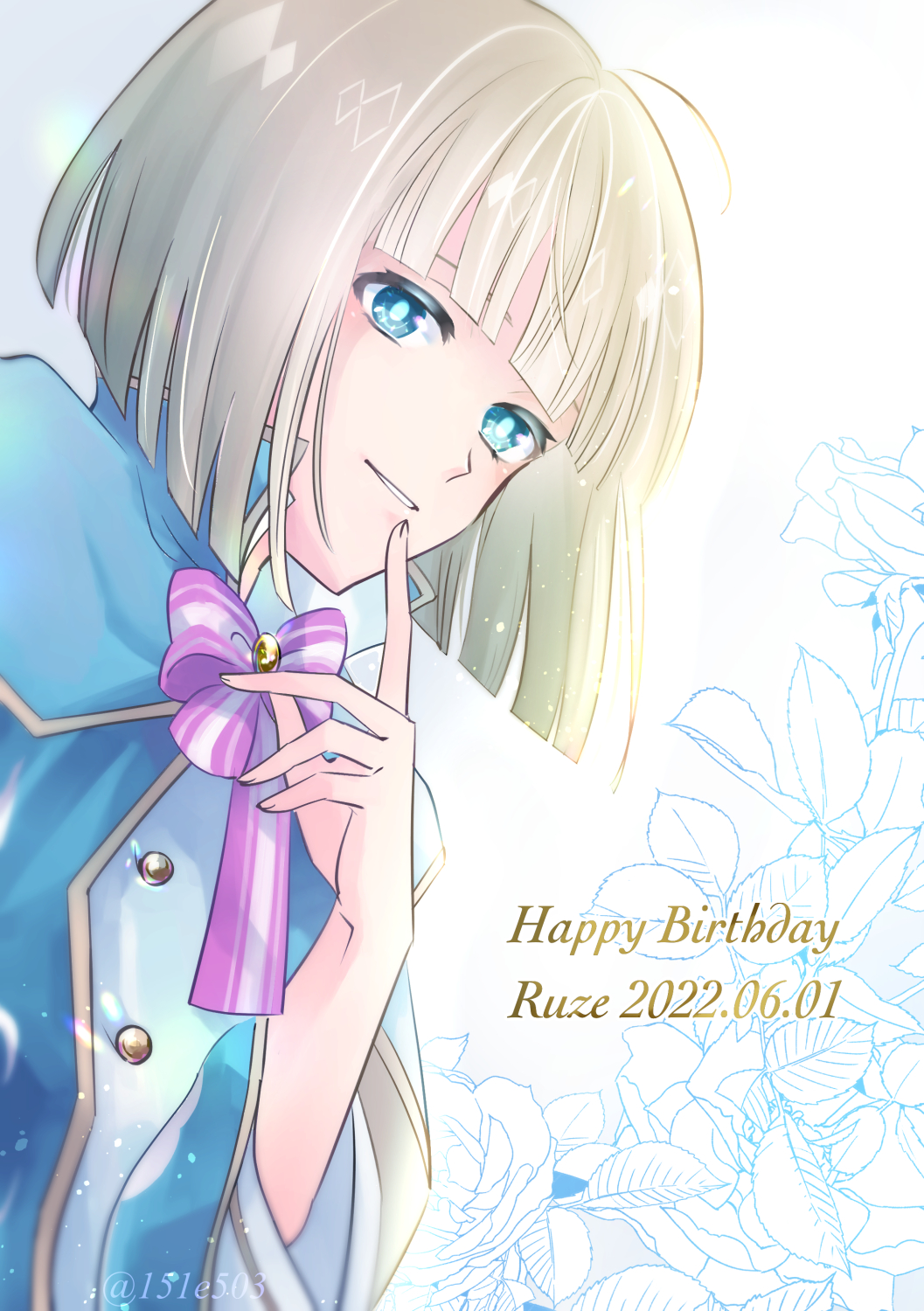 1boy androgynous blonde_hair blue_eyes blue_shirt bowl_cut buttons character_name commentary_request dame_x_prince dated finger_to_mouth happy_birthday highres index_finger_raised long_sleeves looking_at_viewer male_focus parted_lips peko_(pepan) ribbon ruze_selen_el_phiriazar shirt short_hair solo striped_ribbon upper_body white_background
