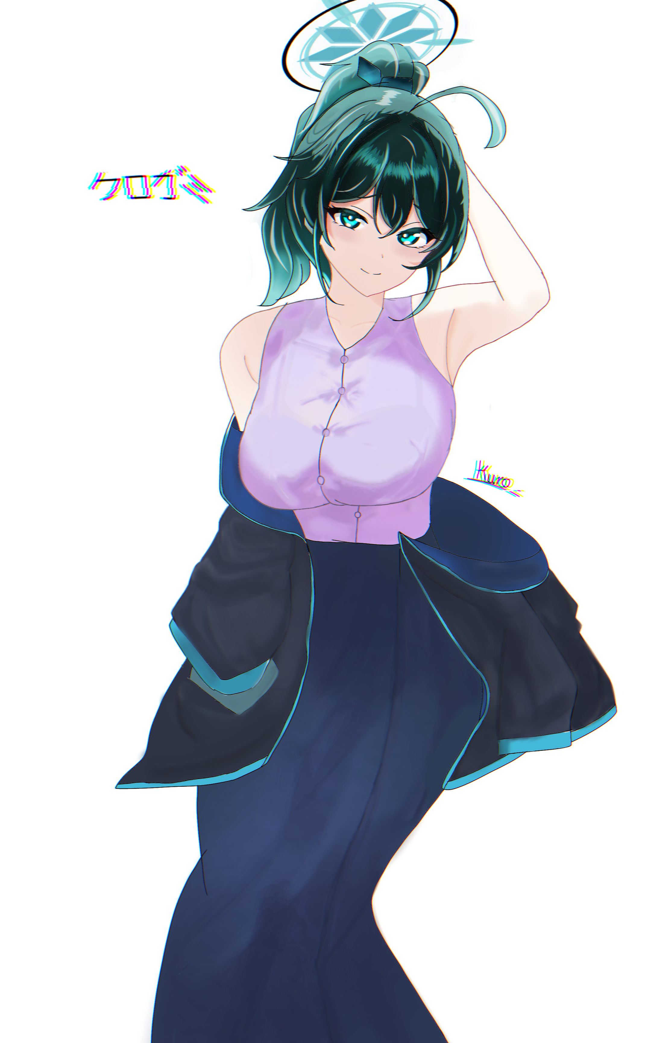 1girl absurdres ahoge armpits arms_behind_head blue_halo coat commentary_request green_eyes green_hair halo highres kurogami_fuyuki looking_at_viewer original ponytail see-through_clothes transparent_background