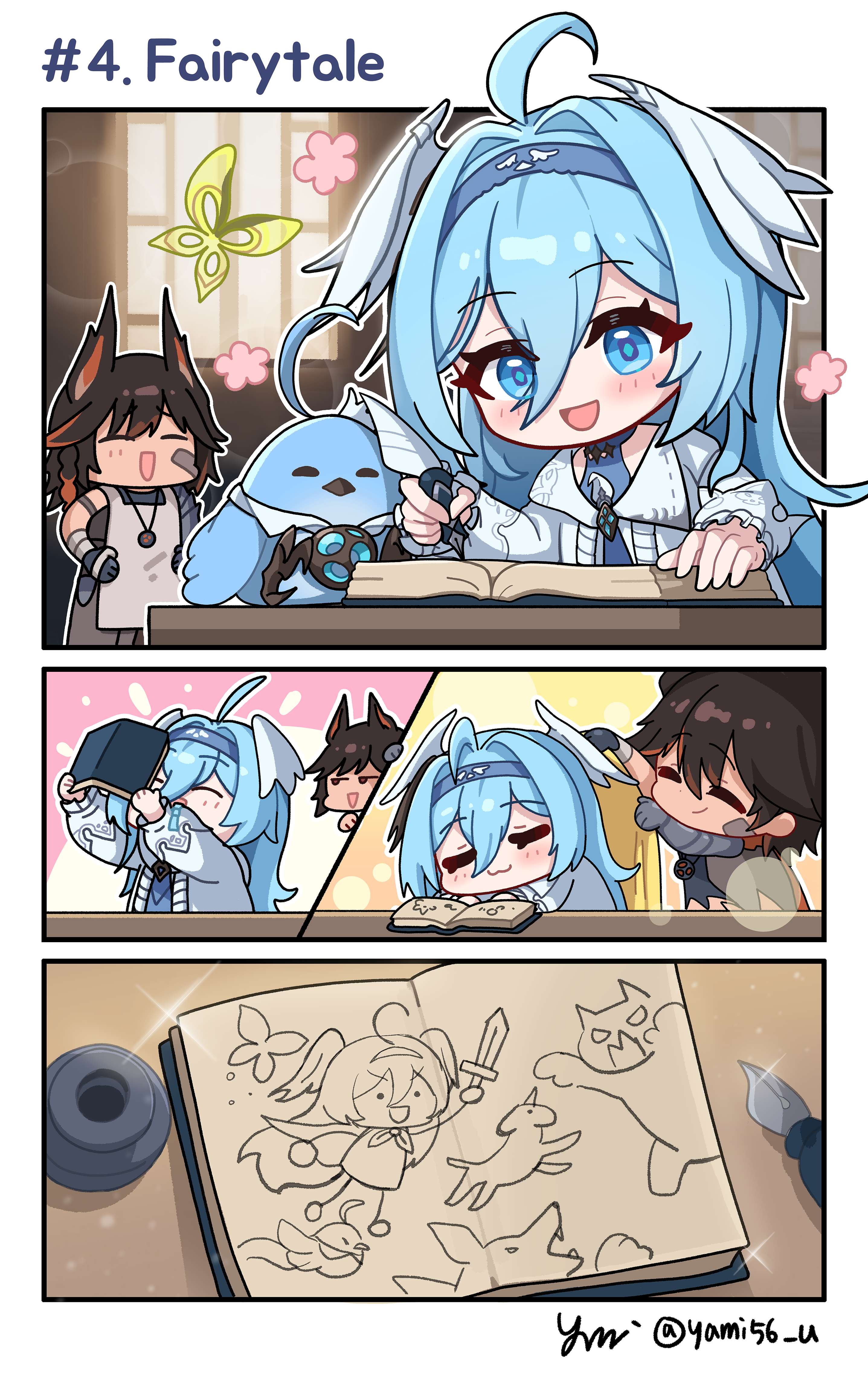 1boy 1girl absurdres ahoge blue_eyes blue_hairband book brown_hair bug butterfly closed_eyes closed_mouth commentary drawing_(action) duet_night_abyss english_commentary fina_(duet_night_abyss) green_butterfly hair_between_eyes hair_intakes hairband head_wings highres holding holding_book holding_quill indoors insect open_book open_mouth outsider_(duet_night_abyss) quill smile wings writing yami_(yami56_u)