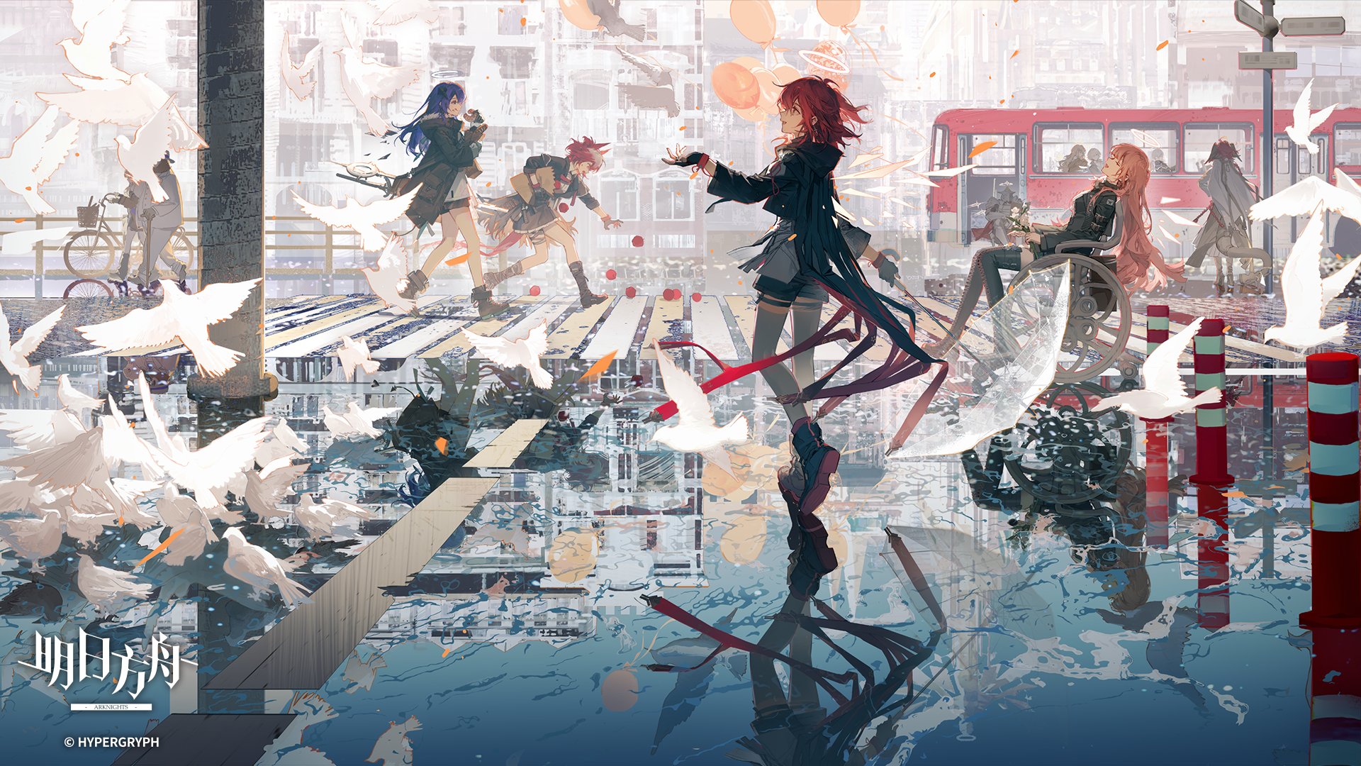 3boys 6+girls adoptive_grandparent_and_adoptive_grandchild andoain_(arknights) apple arknights balloon bird black_boots black_jacket black_shoes black_wings blue_hair boots bus cecelia_(arknights) chinese_commentary commentary_request copyright_logo copyright_notice crosswalk demon_horns detached_wings donut dove energy_wings enforcer_(arknights) exusiai_(arknights) exusiai_the_new_covenant_(arknights) fiammetta_(arknights) food fruit gracebearer_(arknights) grandfather_and_granddaughter halo head_wings highres holding horns jacket lemuen_(arknights) logo min_(120716) mostima_(arknights) motor_vehicle multiple_boys multiple_girls official_art paganini_(arknights) people red_hair reflection road road_sign sankta_miksaparato_(arknights) shoes shorts sign sleeping staff standing tail thigh_boots traditional_halo vannini_(arknights) walking wheelchair white_halo wings