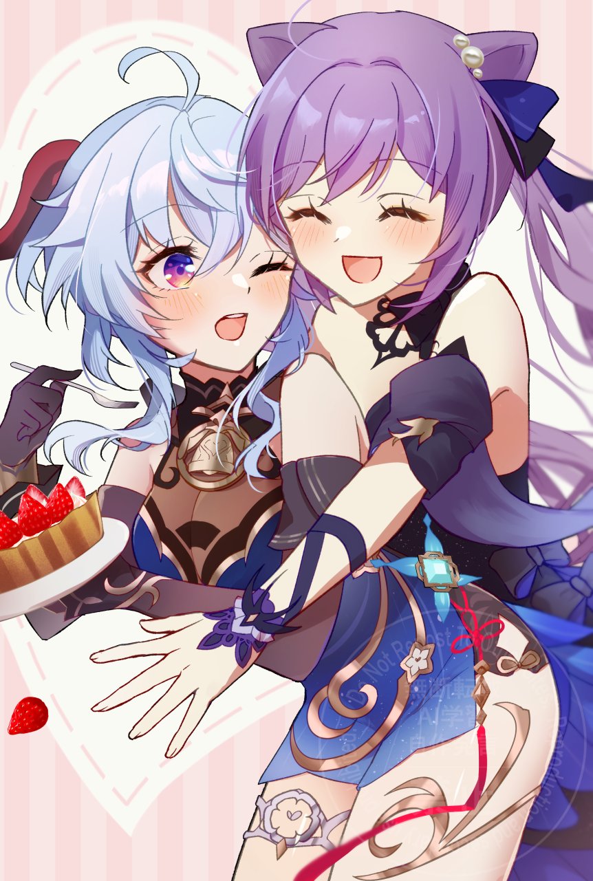 2girls 3sat0 ahoge bare_shoulders bell black_dress black_gloves blue_dress blue_hair breasts cake cleavage closed_eyes cone_hair_bun detached_sleeves double_bun dress food fork ganyu_(genshin_impact) ganyu_(twilight_blossom)_(genshin_impact) genshin_impact gloves gradient_clothes gradient_dress hair_bun hair_ears hair_ornament highres horns keqing_(genshin_impact) keqing_(opulent_splendor)_(genshin_impact) long_hair medium_breasts multiple_girls neck_bell official_alternate_costume official_alternate_hairstyle one_eye_closed pearl_hair_ornament purple_eyes purple_hair see-through_cleavage see-through_clothes sideless_dress smile strapless strapless_dress twintails