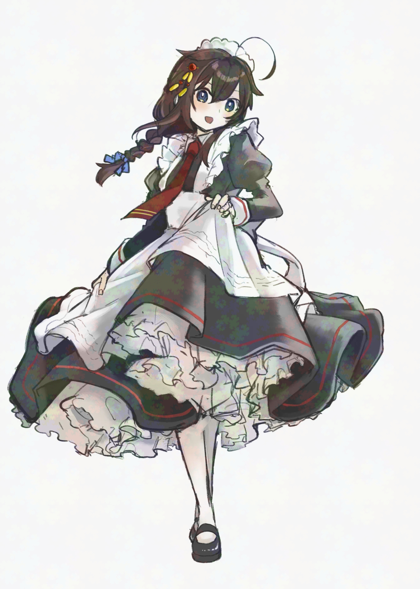 1girl alternate_costume apron black_dress black_hair blue_eyes braid dress enmaided frilled_apron frills full_body hair_flaps hair_ornament holding_own_dress kantai_collection kurou_oruha maid maid_headdress mary_janes shigure_(kancolle) shigure_kai_san_(kancolle) shoes simple_background single_braid socks solo white_apron white_background white_socks
