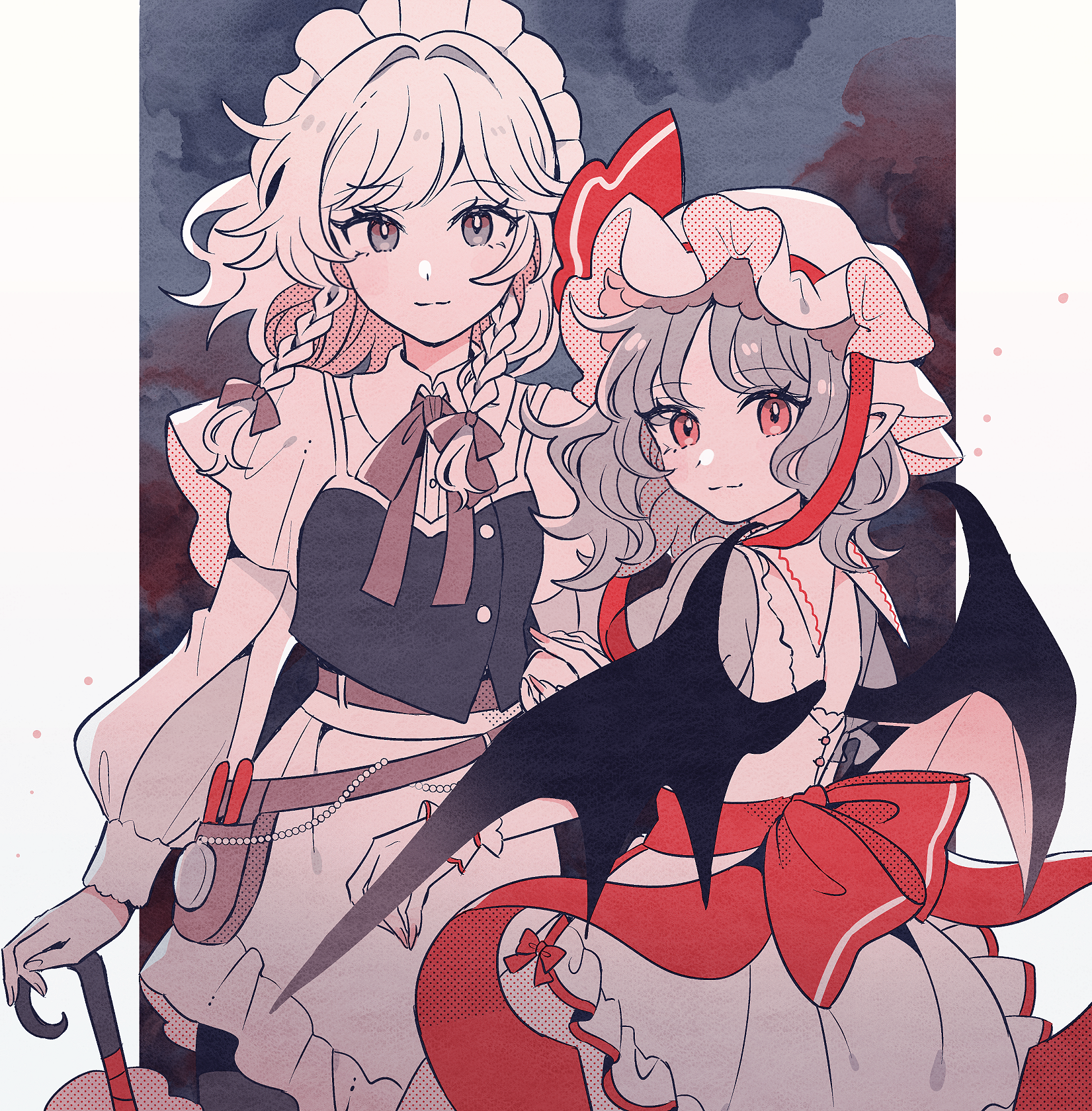 2girls apron back_cutout bat_wings blue_hair bow bowtie braid closed_mouth clothing_cutout collared_shirt commentary_request grey_hair hair_between_eyes hair_bow hat hat_ribbon highres holding holding_umbrella izayoi_sakuya long_hair long_sleeves looking_at_viewer maid_headdress mob_cap mozukuzu_(manukedori) multiple_girls pointy_ears puffy_long_sleeves puffy_short_sleeves puffy_sleeves red_bow red_bowtie red_eyes red_nails red_ribbon remilia_scarlet ribbon shirt short_hair short_sleeves smile touhou twin_braids umbrella upper_body waist_apron white_hair wings wrist_cuffs