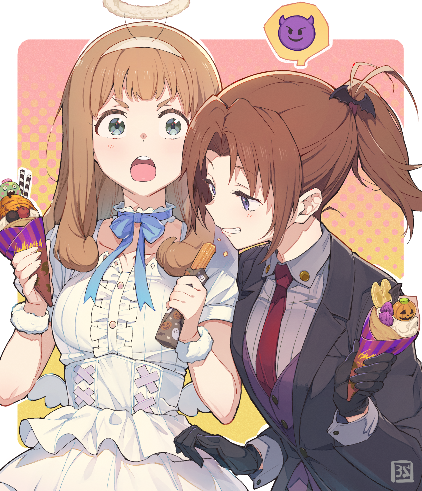 2girls 3s_(tarariko) :o angel angel_and_devil angel_wings bat_(animal) black_gloves black_jacket blazer blonde_hair blue_bow blue_eyes blue_ribbon blush bow brown_hair choker collared_shirt commentary_request crepe dress food formal_clothes frills gloves green_eyes grey_shirt grin hair_ornament hairband halloween halo hibike!_euphonium highres holding holding_food ice_cream_cone jacket long_hair long_sleeves looking_at_another multiple_girls nakagawa_natsuki neck_ribbon necktie open_mouth ponytail purple_eyes purple_shirt purple_vest red_necktie ribbon shirt short_sleeves smile suit teeth v-shaped_eyebrows vest white_dress white_hairband white_shirt wing_collar wings yoshikawa_yuuko