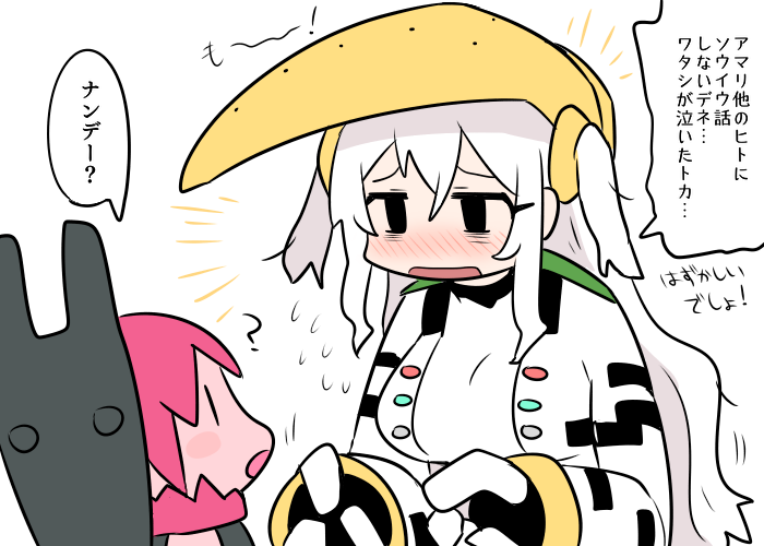 2girls bags_under_eyes black_eyes blush_stickers bodysuit colored_skin commentary drago_(kasugai_(de-tteiu)) flying_sweatdrops kasugai_(de-tteiu) long_hair makhia_(kasugai_(de-tteiu)) mask mask_on_head messy_hair multiple_girls nintendo personification pink_skin pokemon red_hair short_twintails sidelocks single_blush_sticker twintails white_bodysuit white_hair worried