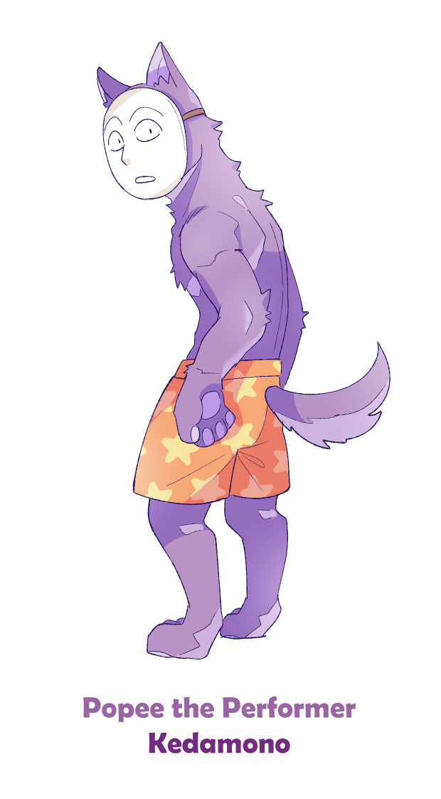 1boy english_text furry furry_male kedamono_(popee_the_performer) lizard_taro male_focus mask orange_shorts popee_the_performer purple_fur shorts simple_background solo_focus tail white_background wolf wolf_boy
