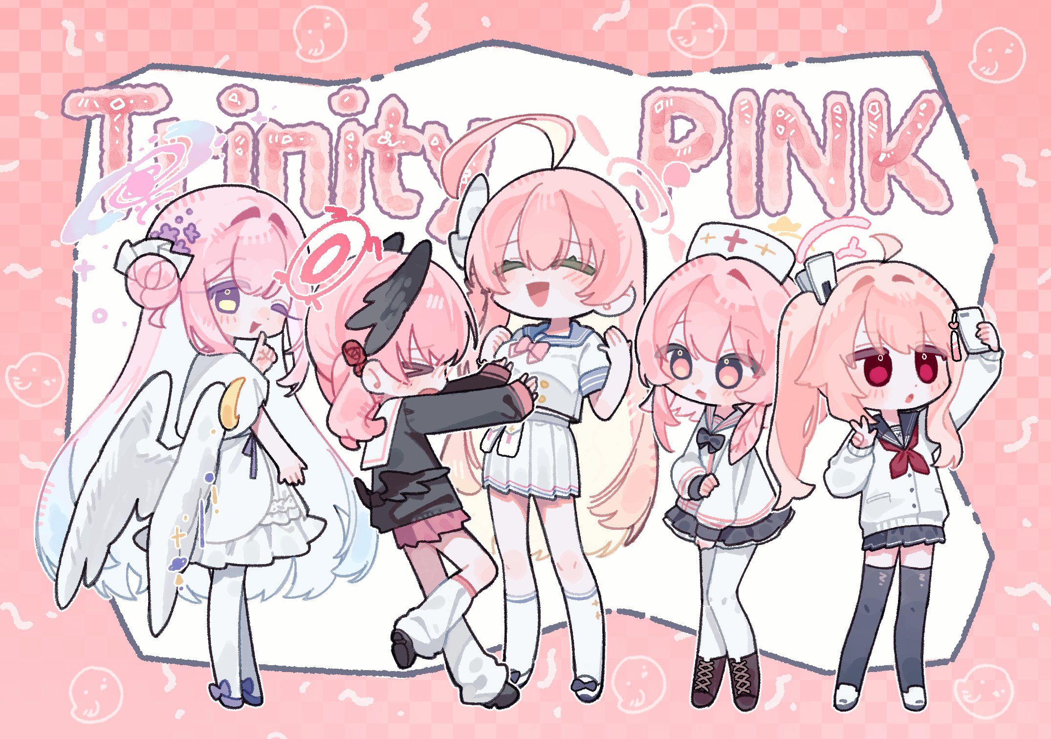 >_< 5girls ahoge black_sailor_collar black_shoes black_skirt black_thighhighs black_wings blue_archive blue_sailor_collar blush boots breasts cellphone chibi chibi_only closed_eyes color_connection commentary_request dress english_text feathered_wings finger_to_mouth flower hair_bun hair_color_connection hair_flower hair_ornament halo hanako_(blue_archive) hat head_wings highres holding holding_phone index_finger_raised koharu_(blue_archive) korean_commentary leg_warmers long_hair mika_(blue_archive) multiple_girls nagakiras2 natsu_(blue_archive) neckerchief nurse_cap open_mouth pantyhose phone pink_eyes pink_hair pleated_skirt purple_flower red_eyes sailor_collar school_uniform serafuku serina_(blue_archive) shoes side_ponytail single_side_bun skirt socks standing thighhighs very_long_hair w white_dress white_hat white_leg_warmers white_pantyhose white_sailor_collar white_skirt white_socks white_wings wing_ornament wings