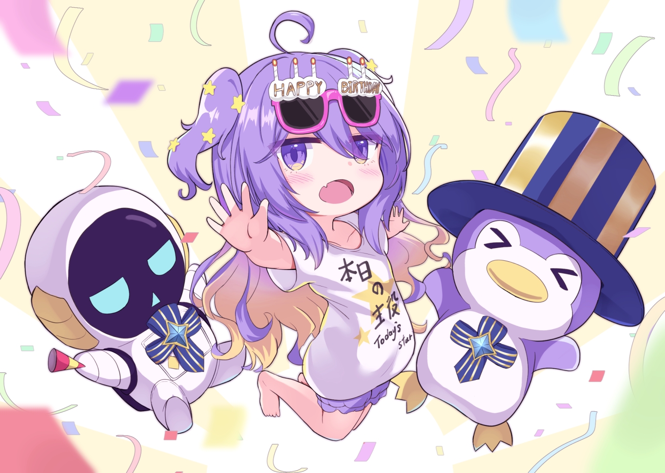 >_< 1girl bird blush clothes_writing collarbone commentary confetti english_commentary fang hair_between_eyes hat hololive hololive_indonesia huziiro_matutya moona_hoshinova moonabito_(moona_hoshinova) open_mouth outstretched_arms penguin pororo_(moona_hoshinova) purple_hair purple_shorts robot shirt shorts skin_fang spread_arms t-shirt top_hat virtual_youtuber white_shirt