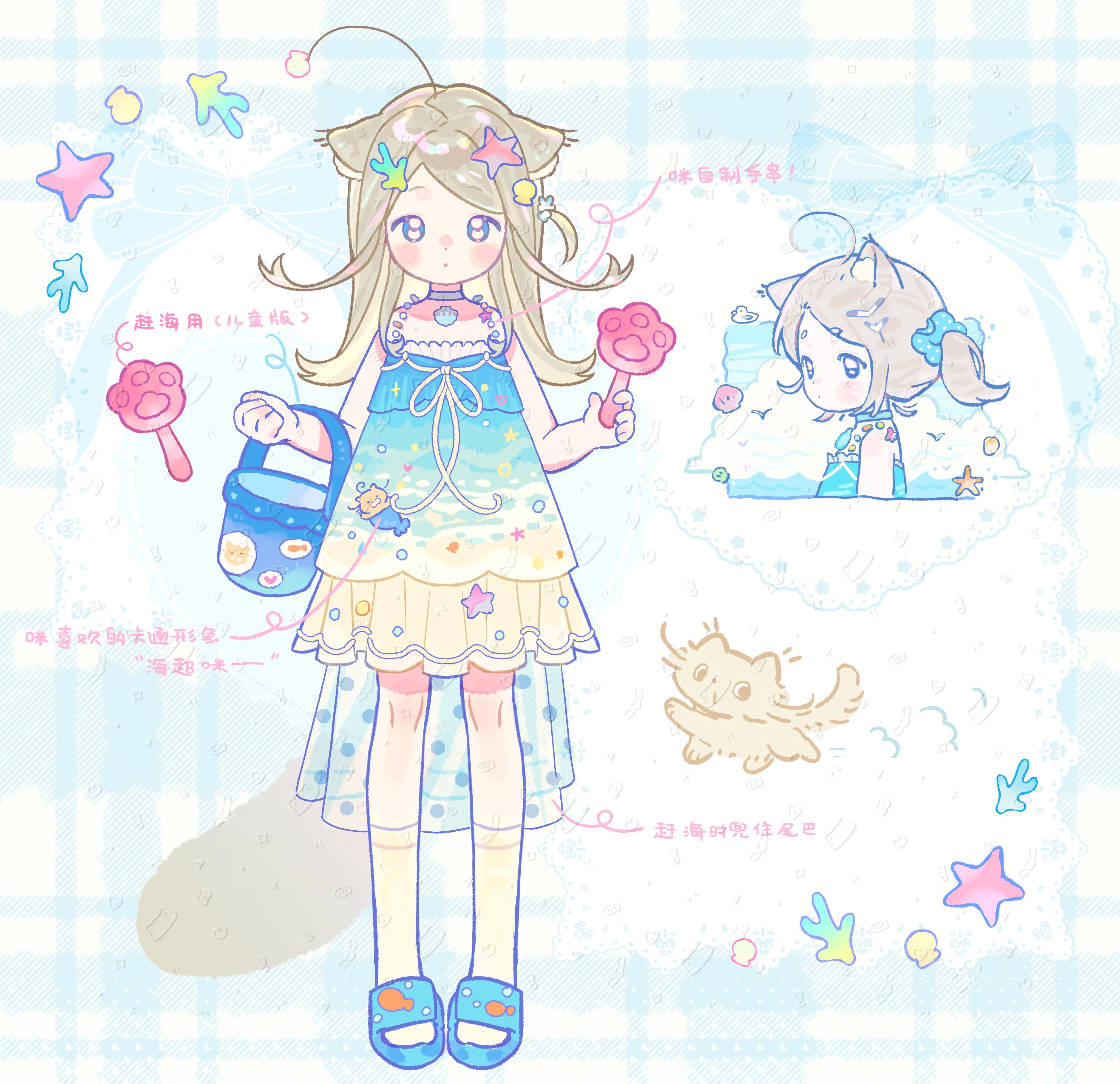 1girl absurdres animal_ear_fluff animal_ears bai_yang_zi bare_shoulders blue_background blue_dress blue_sandals blue_scrunchie blush_stickers brown_hair bucket cat_ears cat_girl choker closed_mouth dress ears_down full_body hair_ornament hair_scrunchie highres long_hair looking_at_viewer multiple_views original parted_bangs sandals scrunchie short_hair short_twintails sleeveless sleeveless_dress socks standing twintails white_choker yellow_socks