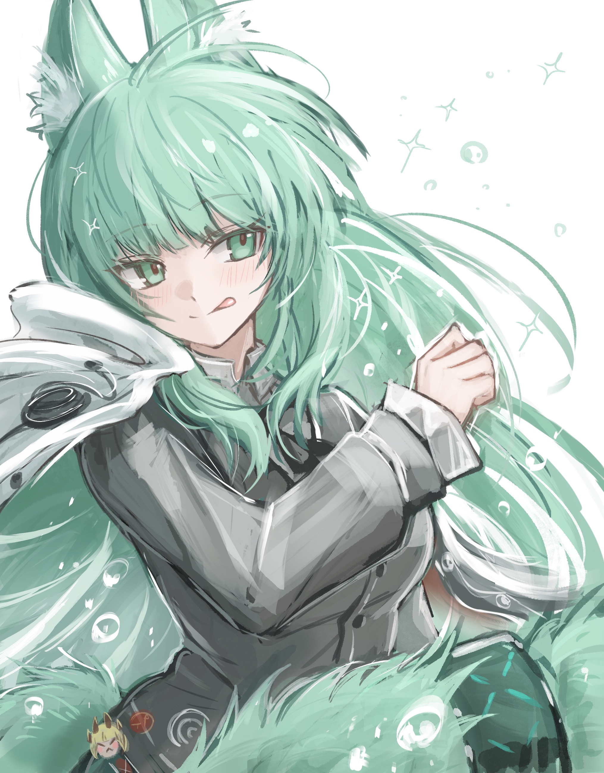 1girl 3_(sanyako1) :q absurdres animal_ear_fluff animal_ears arknights badge breasts button_badge buttons cape cat_ears cat_girl chibi chibi_inset collared_shirt commentary dot_nose green_eyes green_hair grey_shirt hand_up harmonie_(arknights) highres light_blush long_hair long_sleeves looking_to_the_side medium_breasts reed_(arknights) shirt simple_background smile solo sparkle split_mouth tongue tongue_out upper_body white_background white_cape