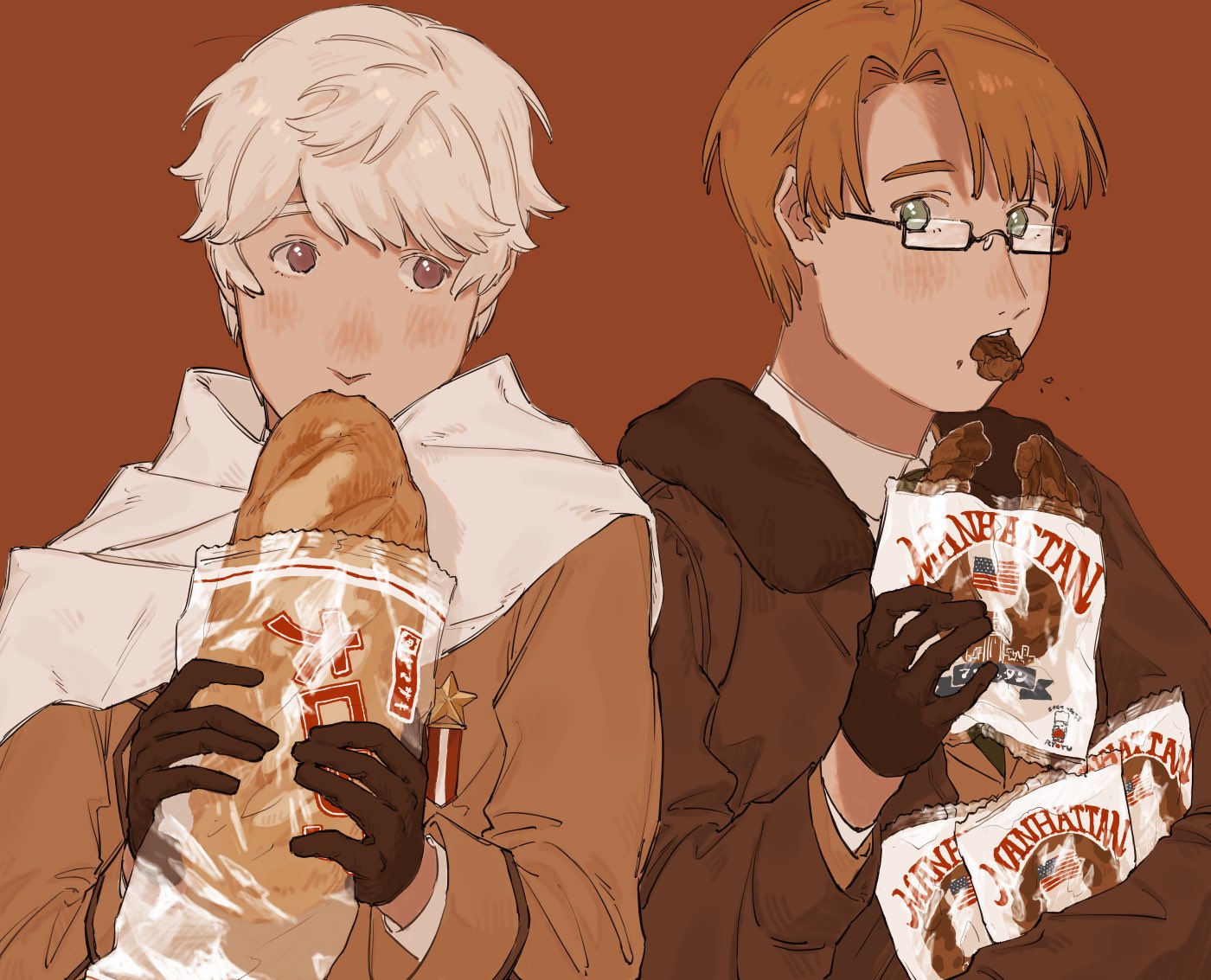 2boys ahoge america_(hetalia) american_flag american_flag_print axis_powers_hetalia bag black-framed_eyewear blush bread brown_background brown_coat brown_gloves brown_hair brown_jacket coat collared_shirt commentary_request eating flag_print food food_on_face fur-trimmed_jacket fur_trim glasses gloves green_eyes green_necktie hands_up holding holding_bag holding_food jacket lapels long_sleeves looking_at_another male_focus medal military military_jacket military_uniform morikusu_01 multiple_boys necktie open_clothes open_jacket open_mouth pastry plastic_bag puffy_long_sleeves puffy_sleeves purple_eyes russia_(hetalia) scarf semi-rimless_eyewear shirt short_hair simple_background star_ornament teeth upper_body white_hair white_scarf white_shirt