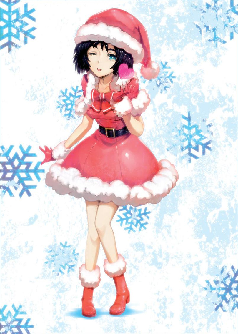1girl belt belt_buckle black_belt black_hair blue_background blue_eyes blush bob_cut boots bow breasts buckle capelet chest_bow christmas collarbone cropped dress full_body fur-trimmed_boots fur-trimmed_capelet fur-trimmed_dress fur-trimmed_gloves fur_trim gloves hat huke knees_together_feet_apart leaning_forward leather_belt looking_at_viewer medium_breasts official_art one_eye_closed open_mouth red_boots red_bow red_dress red_gloves ringed_eyes santa_costume santa_hat science_adventure shiina_mayuri short_hair short_sleeves smile snowflake_background solo square_pupils steins;gate steins;gate_0 tareme tongue