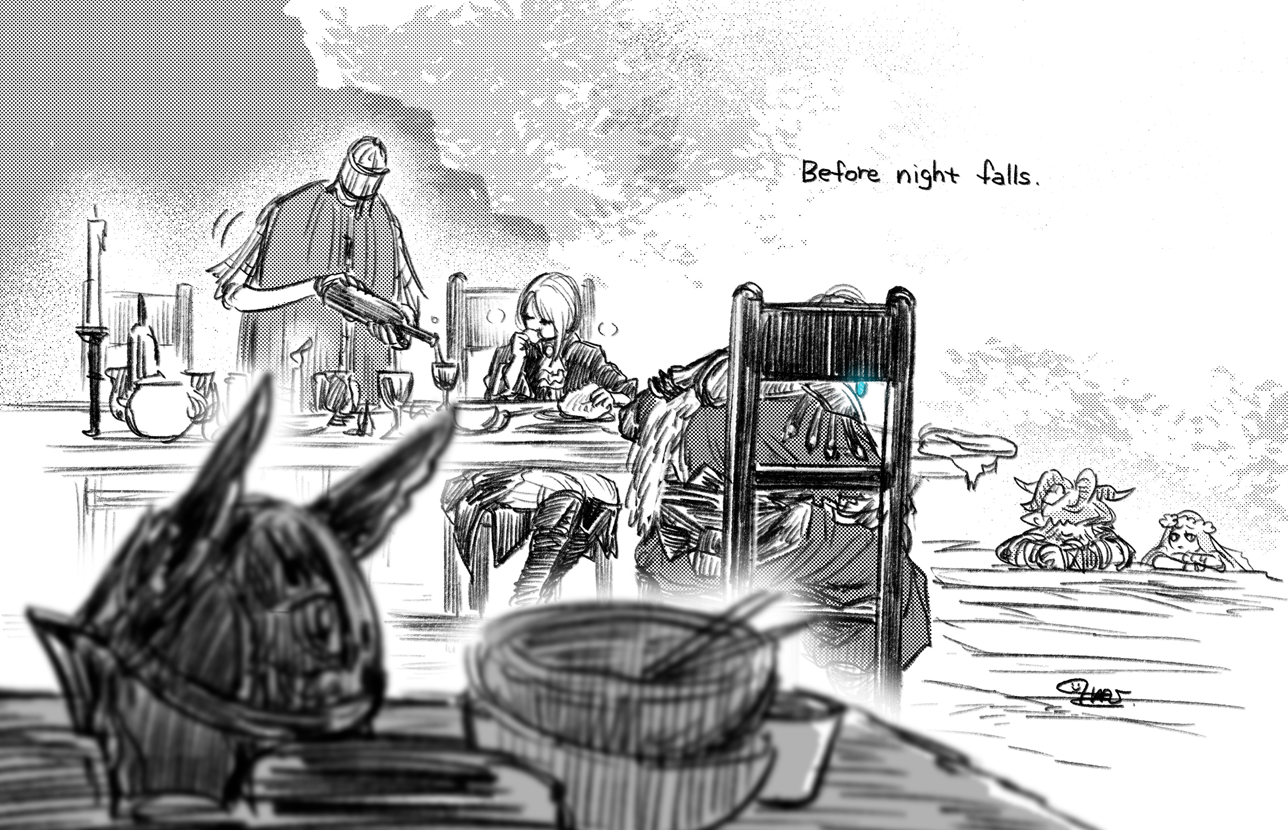 2boys 2girls absurdres ascot blurry blurry_foreground boots bowl candle commentary_request cup duchess_(elden_ring) eating elden_ring elden_ring_nightreign english_text fake_horns greyscale haruichi_(haruichithm) head_wreath helmet highres horned_helmet horns jacket monochrome multiple_boys multiple_girls pants pouring raider_(elden_ring) revenant_(elden_ring) spot_color tunic veil winged_helmet wylder_(elden_ring)