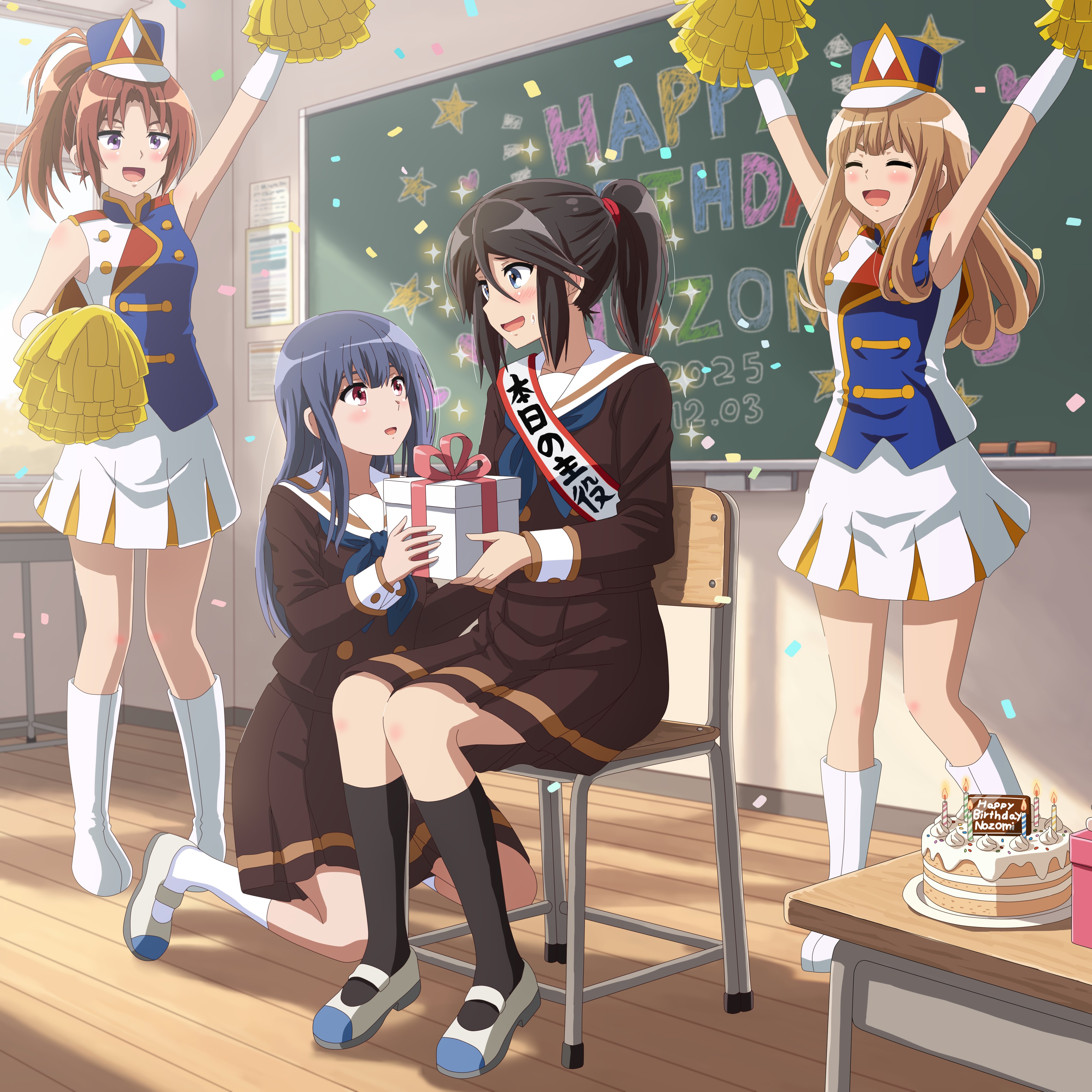 4girls absurdres band_uniform black_hair black_socks blue_hair blue_sailor_collar blush boots box brown_eyes brown_jacket brown_skirt cake chair chalkboard cheerleader classroom commentary_request day food gift gift_box hangaku happy happy_birthday hat hibike!_euphonium highres indoors jacket kasaki_nozomi kenzaki_ririka kitauji_high_school_uniform liz_to_aoi_tori long_hair long_sleeves looking_at_another multiple_girls nakagawa_natsuki open_mouth pom_pom_(cheerleading) sailor_collar school_uniform shako_cap shoes sitting skirt socks table white_boots white_shoes white_skirt window yoroizuka_mizore yoshikawa_yuuko