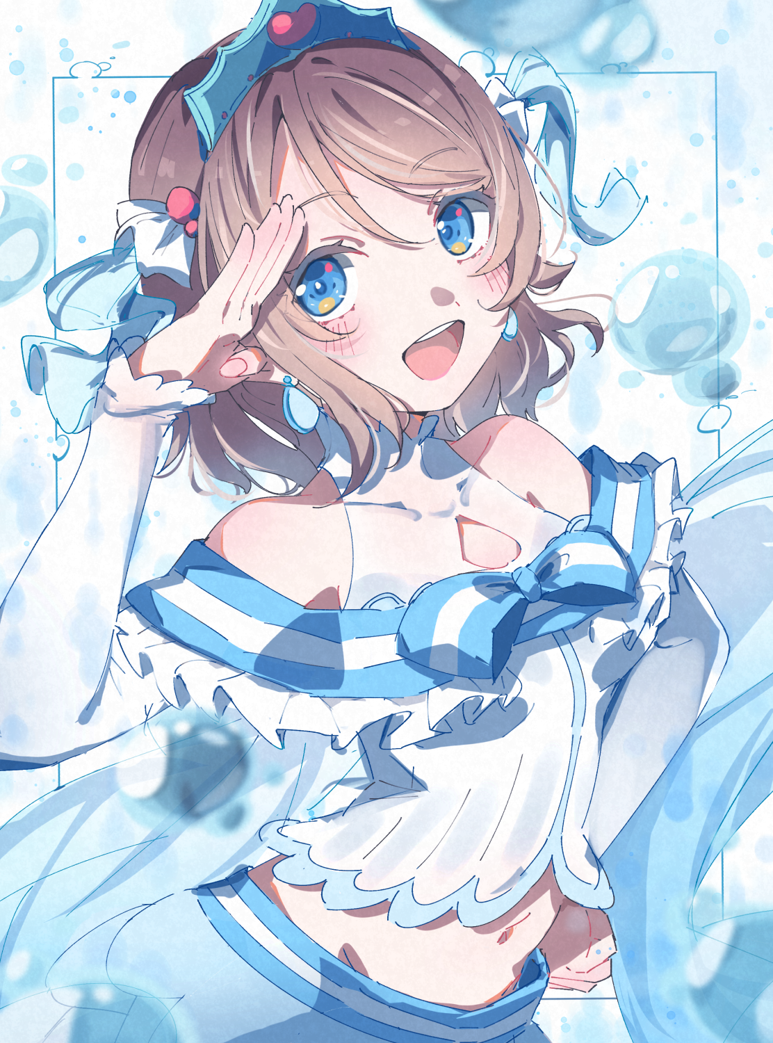 1girl 493water air_bubble arched_back arm_up bare_shoulders blue_background blue_eyes bracelet brown_hair bubble clothing_cutout commentary_request dress earrings frills gem grey_hair hand_on_own_hip head_tilt heart highres idol jewelry koi_ni_naritai_aquarium looking_at_viewer love_live! love_live!_sunshine!! midriff navel pearl_bracelet red_gem ribbon salute simple_background single_earring skirt smile solo striped_clothes tiara watanabe_you white_background
