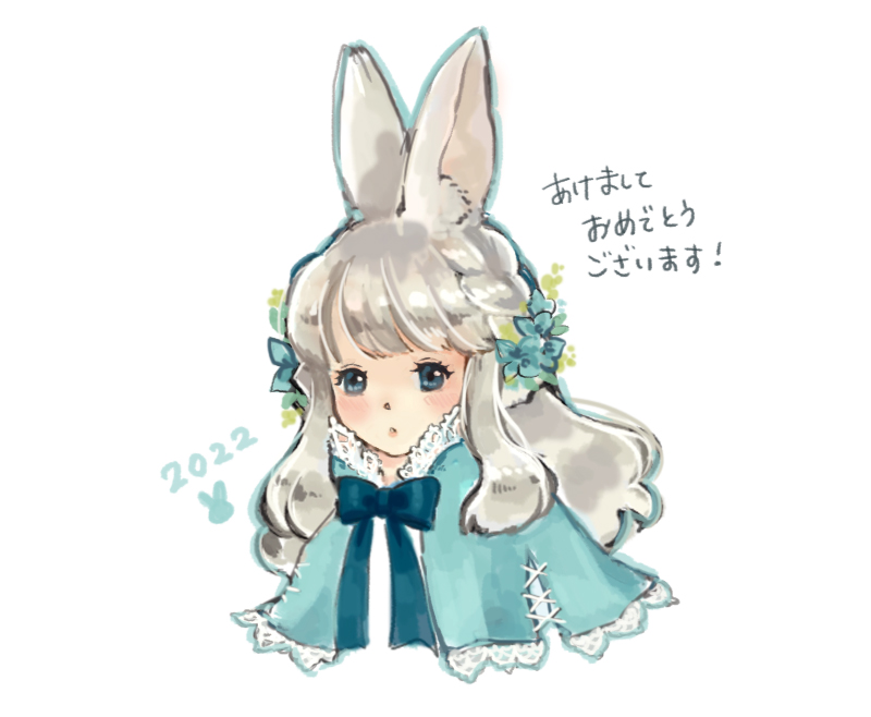 1girl 2022 animal_ears blue_bow blue_bowtie blue_capelet blue_eyes blue_flower bow bowtie capelet commentary_request expressionless flower gobaku_no_hito grey_hair hair_flower hair_ornament lace-trimmed_capelet lace_trim long_hair looking_at_viewer open_mouth rabbit_ears rabbit_girl ragnarok_masters ragnarok_online simple_background translation_request upper_body white_background