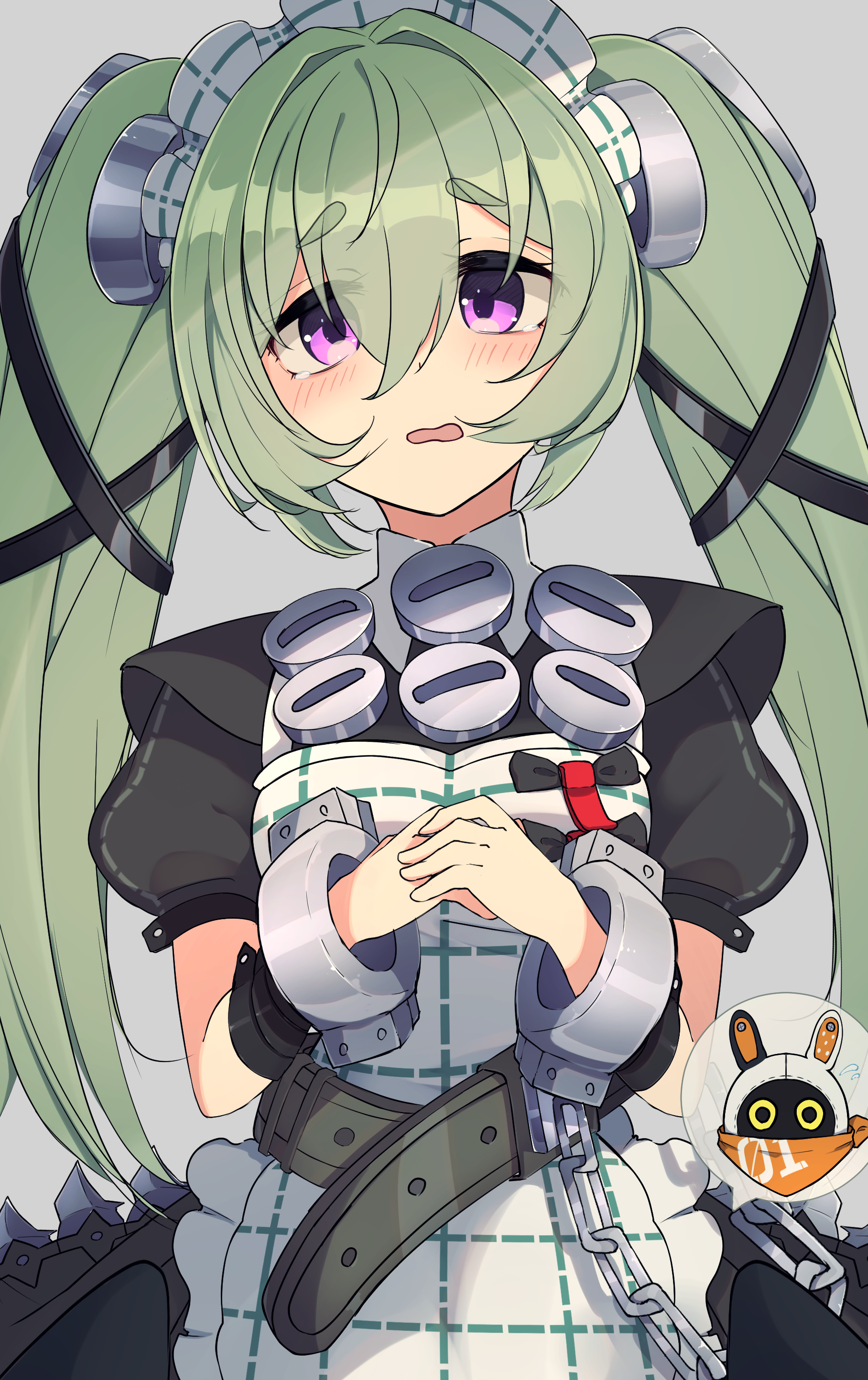 1girl absurdres apron bangboo_(zenless_zone_zero) black_dress breasts chain commentary_request corin_wickes cowboy_shot cuffs dress eous_(zenless_zone_zero) green_hair grey_background hair_between_eyes highres long_hair looking_at_viewer maid maid_apron maid_headdress mountain_yasan open_mouth puffy_short_sleeves puffy_sleeves purple_eyes screw_hair_ornament short_sleeves simple_background spoken_character twintails zenless_zone_zero