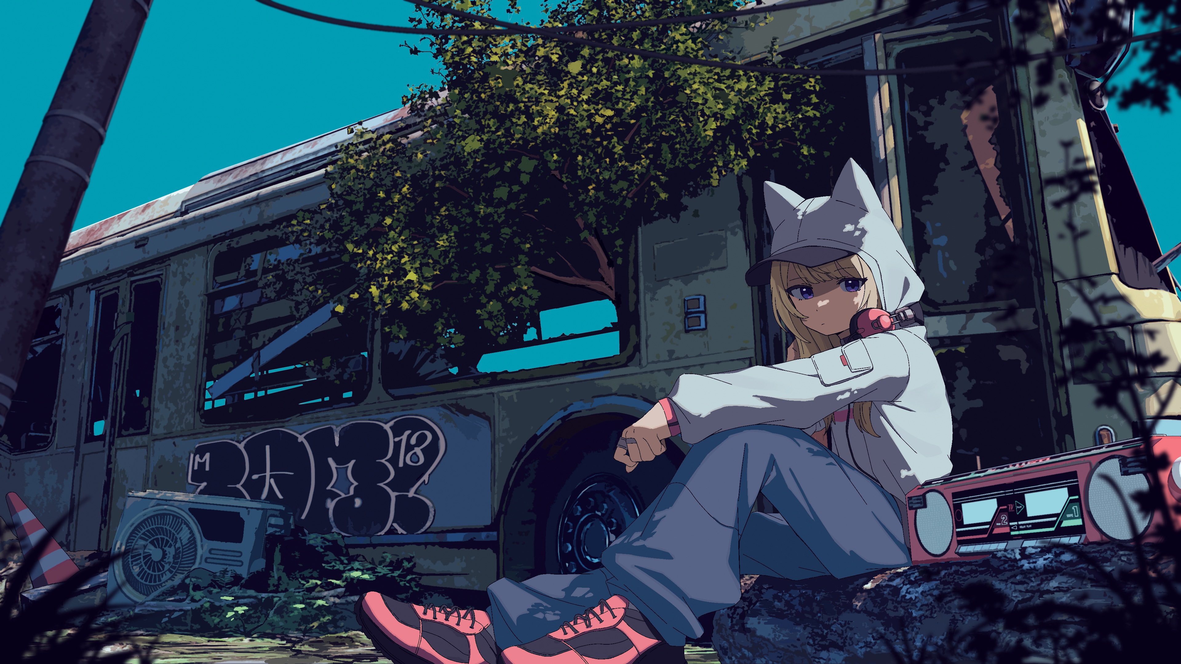 1girl absurdres animal_ears baseball_cap blonde_hair blue_pants blue_sky boombox bus commentary_request condenser_unit dog_ears dog_girl graffiti grey_jacket hat hat_under_hood headphones headphones_around_neck highres hood hood_up hooded_jacket jacket kmnz lita_(kmnz) long_hair long_sleeves motor_vehicle official_art overgrown pants pink_shoes puffy_long_sleeves puffy_sleeves purple_eyes pusen_(puuu_sen555) ruins shoes sitting sky sneakers solo traffic_cone virtual_youtuber