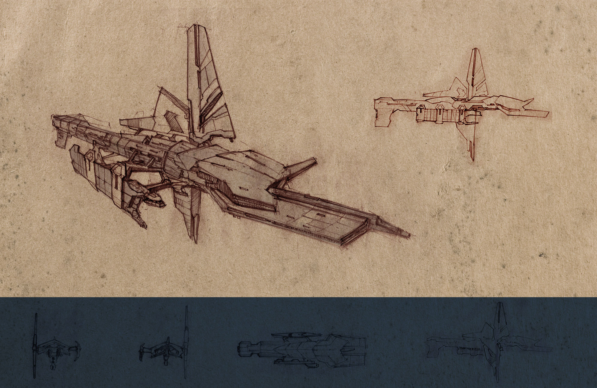 blueprint_(medium) brown_theme commentary concept_art corvette_(eve_online) english_commentary eve_online from_side highres military_vehicle minmatar_republic_(eve_online) multiple_views no_humans original pintoro science_fiction solar_panel spacecraft vehicle_focus