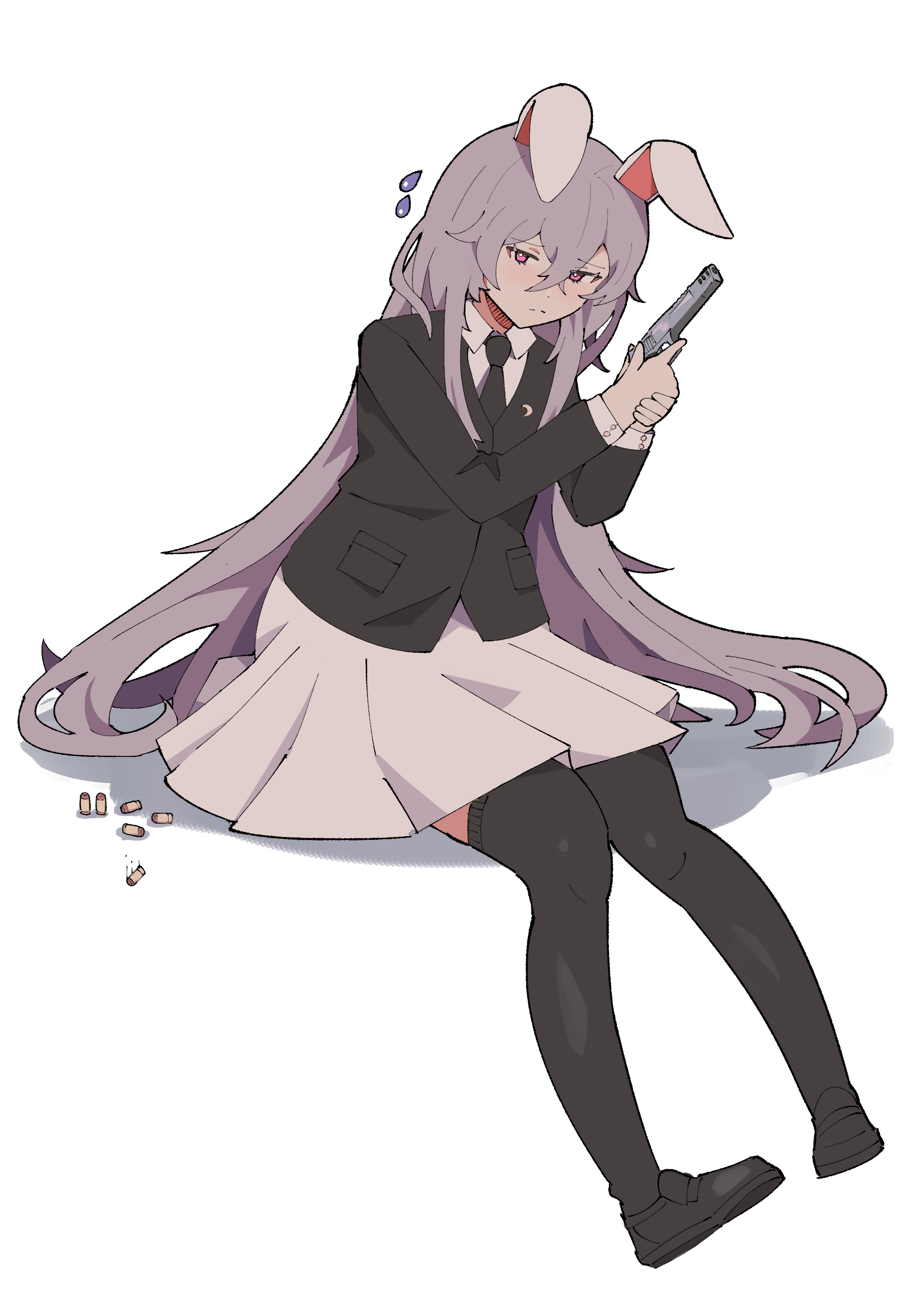 1girl absurdres animal_ears black_jacket black_necktie black_shoes black_thighhighs bullet commentary full_body grimlisp gun handgun highres holding holding_gun holding_weapon jacket loafers long_hair necktie pink_skirt purple_hair rabbit_ears rabbit_girl red_eyes reisen_udongein_inaba shoes simple_background sitting skirt thighhighs touhou weapon white_background