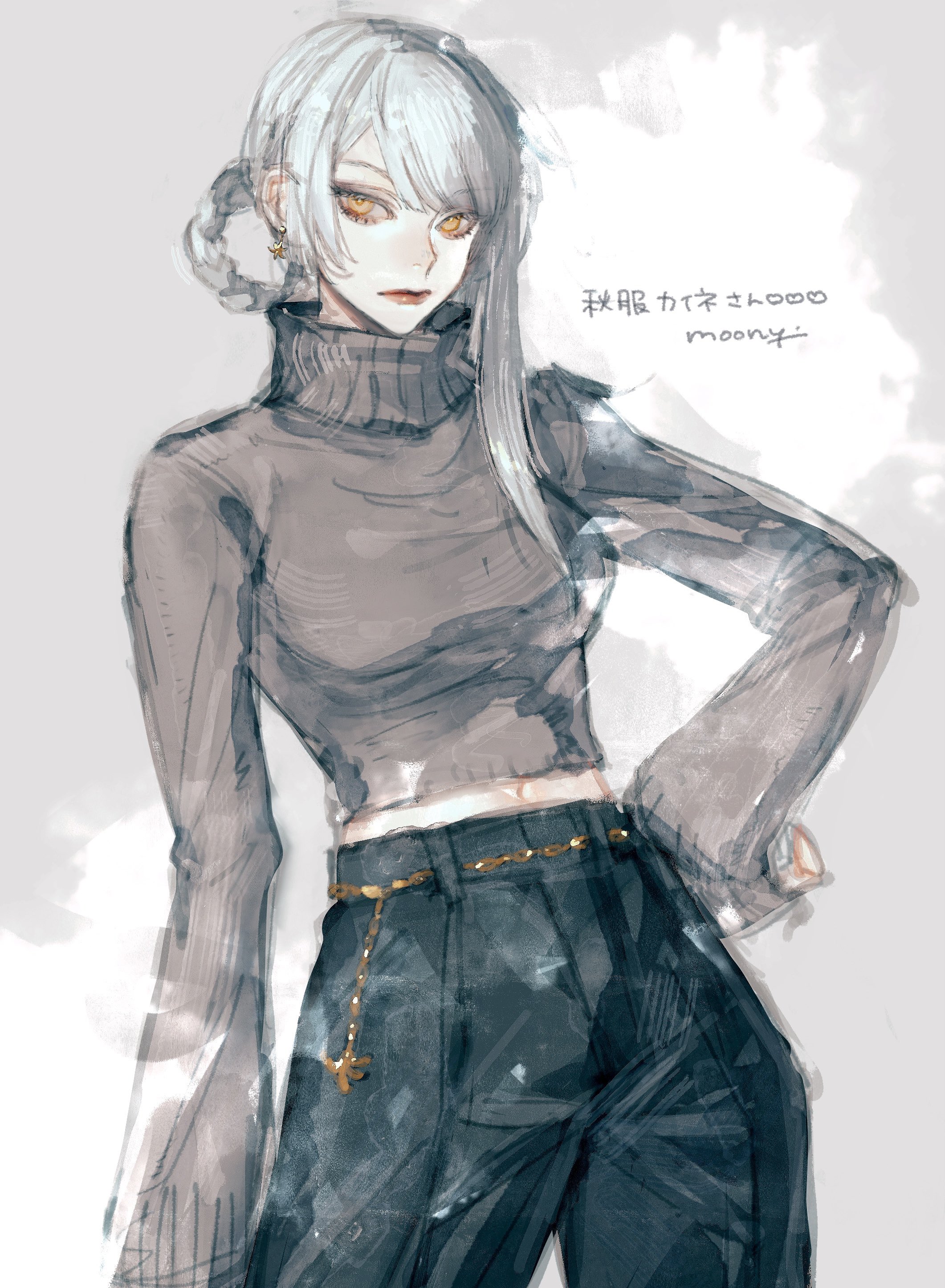 1girl absurdres artist_name black_pants braid braided_hair_rings breasts brown_eyes closed_mouth cowboy_shot cropped_sweater flower grey_background grey_hair grey_sweater hair_between_eyes hair_flower hair_ornament hair_rings hand_on_own_hip highres kaine_(nier) looking_at_viewer medium_breasts midriff moony_(mogmogmelt) nier_(series) pants parted_bangs single_sidelock solo sweater turtleneck turtleneck_sweater white_flower