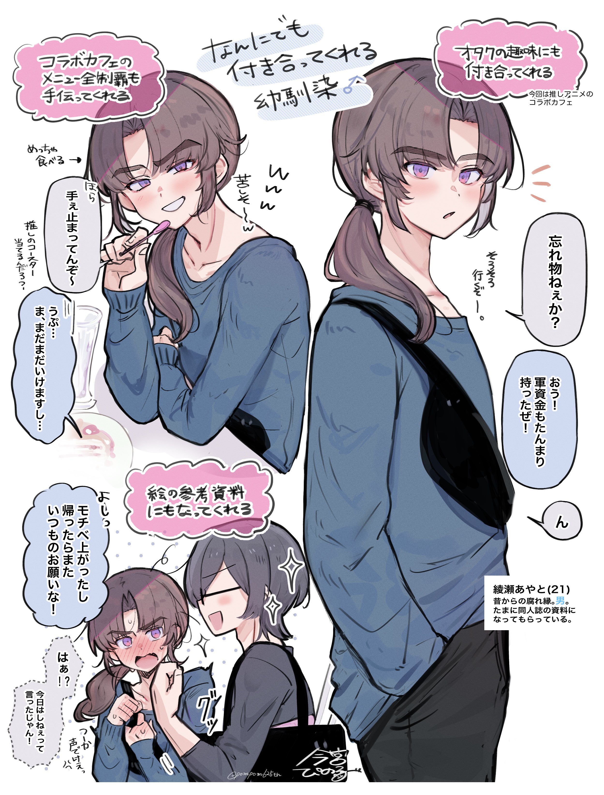2boys absurdres arrow_(symbol) ayase_ayato_(imamiya_pinoko) bag black-framed_eyewear black_bag black_hair blue_sweater blush brown_hair collarbone commentary_request glasses highres imamiya_pinoko long_hair long_sleeves looking_at_viewer low_ponytail male_focus multiple_boys open_mouth original parted_bangs parted_lips ponytail purple_eyes short_hair smile speech_bubble sweater thick_eyebrows translation_request trap twitter_username