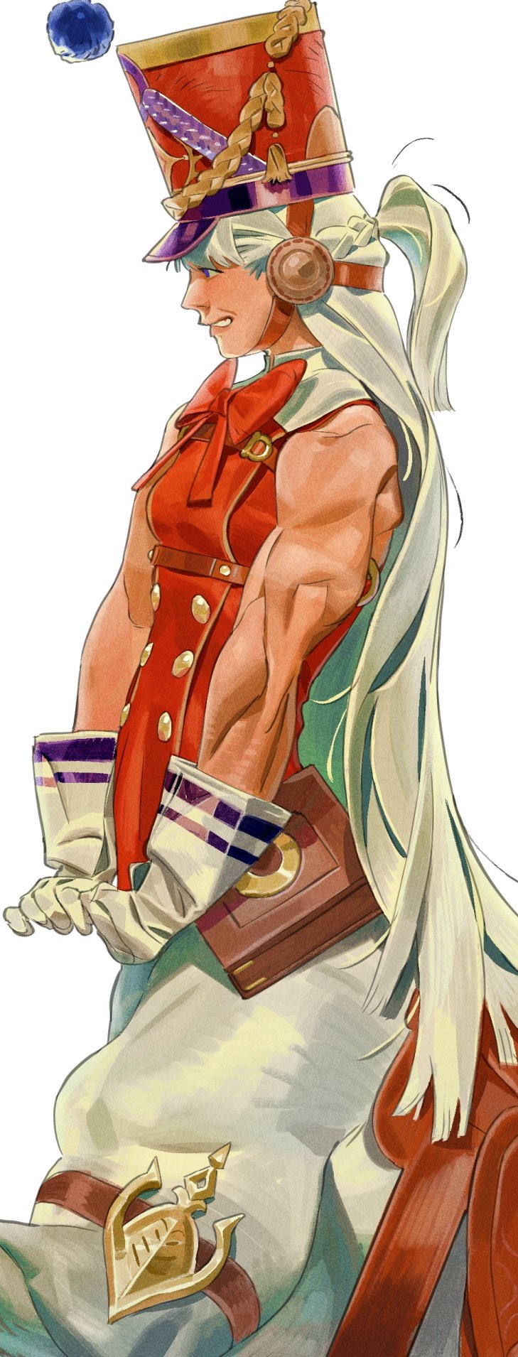 1girl absurdly_long_hair blue_eyes bow bowtie breasts centaur commentary english_commentary from_side gloves gold_ship_(red_strife)_(umamusume) gold_ship_(umamusume) hat highres horse_girl long_hair muscular muscular_female profile red_bow red_bowtie red_hat shirt simple_background sleeveless sleeveless_shirt small_breasts smile solo sssantine taur umamusume very_long_hair white_background white_gloves white_hair
