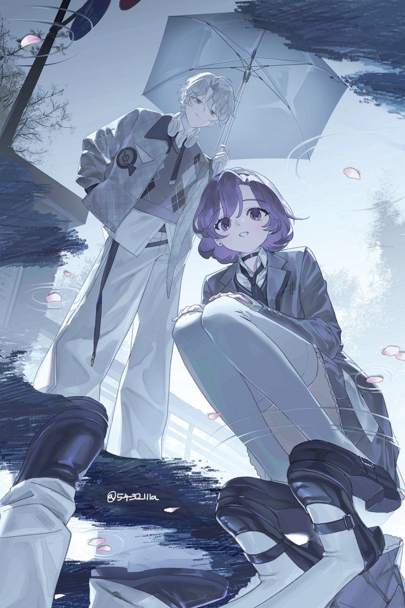 1boy 1girl 9nyo black_choker black_necktie black_shoes brown_sweater character_request choker collared_shirt commission copyright_request curly_hair dress_shirt ear_piercing from_above from_below grey_eyes grey_hair grey_jacket grey_skirt grin hairband hand_in_pocket hand_up hands_on_own_knees hashtag-only_commentary headphones headphones_around_neck holding holding_umbrella jacket lapels legs_together light_blush light_smile loafers looking_at_viewer looking_down necktie open_clothes open_jacket outdoors pants parted_bangs petals piercing puddle purple_eyes purple_hair reflection reflective_liquid school_uniform shirt shirt_under_sweater shoes short_hair skirt smile squatting standing sweater thighhighs twitter_username umbrella white_hairband white_pants white_shirt white_thighhighs zettai_ryouiki
